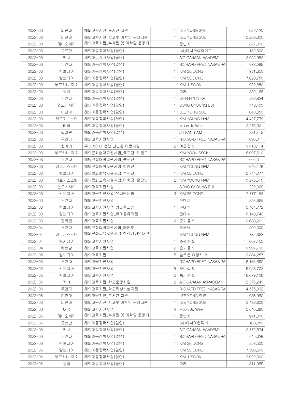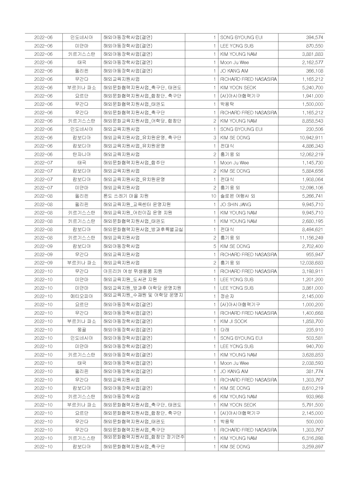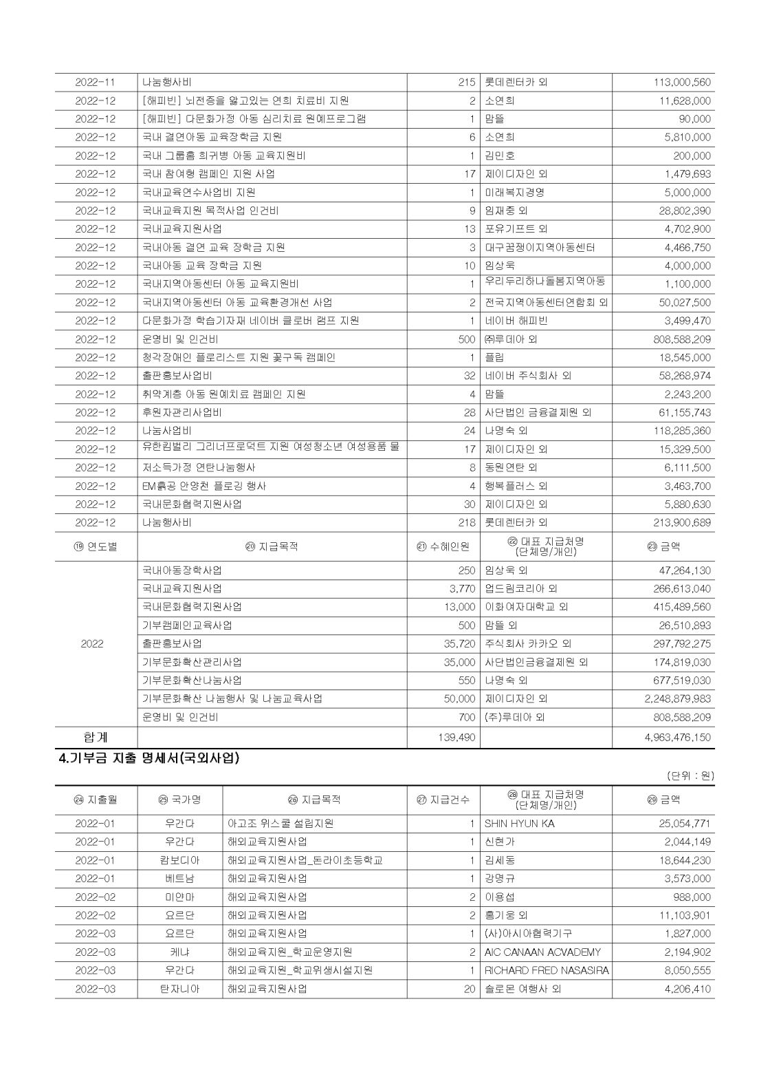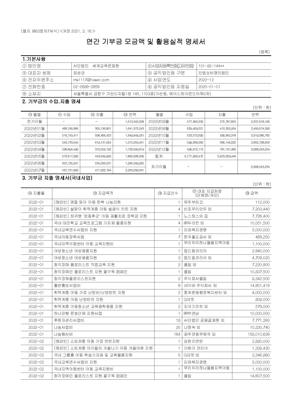 2022년 공개 보고서 기부금 모금액 및 활용실적 명세서