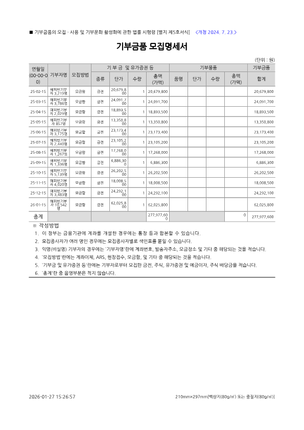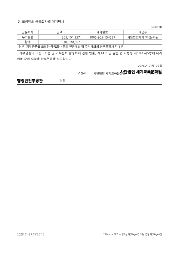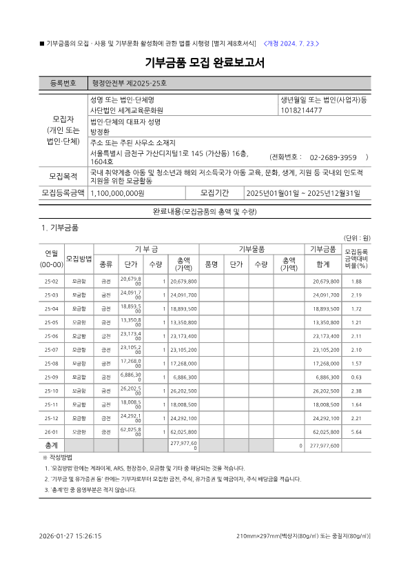 세계교육문화원 2025 기부금품 모집 완료 보고
