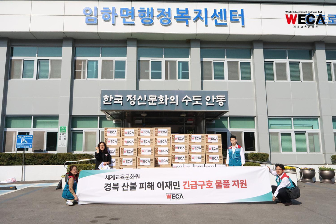 세계교육문화원은 임하면 행정복지센터를 찾아 두유, 컵라면, 반팔 티셔츠 등의 긴급 물품을 전달했으며, 이는 대피소와 가정별로 분배될 예정입니다. 또한 샘뜰지역아동센터를 방문해 아이들에게 필요한 학용품과 간식을 지원하였습니다. 화재 이후 불안정한 환경 속에서도 학업을 이어가야 하는 아이들에게 희망을 전했습니다.