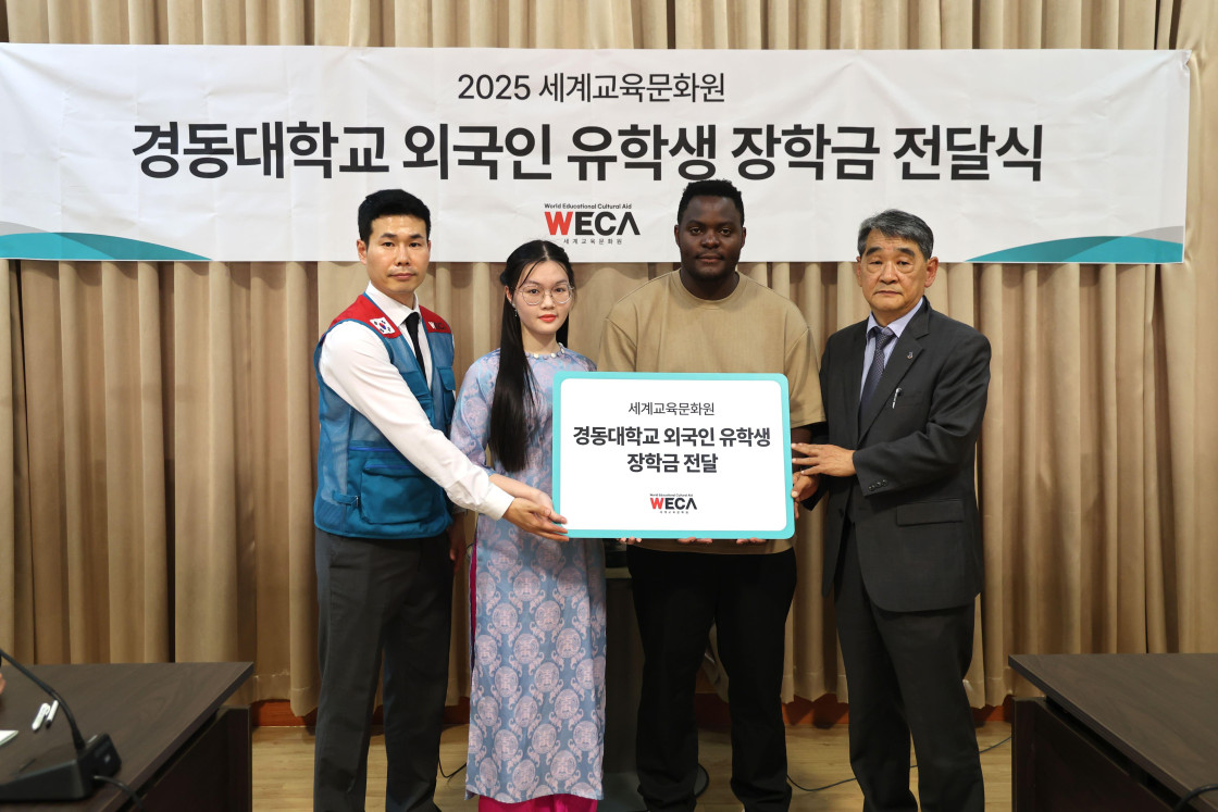 세계교육문화원은 경동대학교 외국인 유학생들을 위한 장학금 전달식을 진행했습니다. 이번 장학금은 세계교육문화원이 교육·문화 지원을 펼치고 있는 국가 중, 성적이 우수한 20명의 학생을 선정해 수여하였습니다.