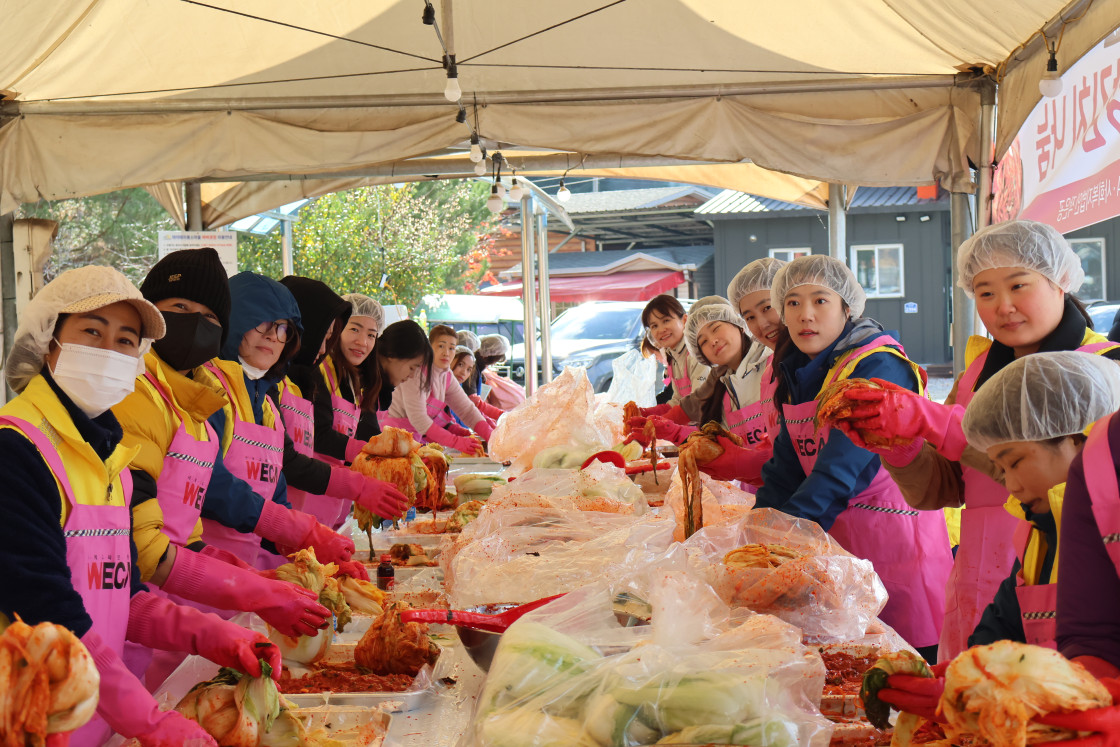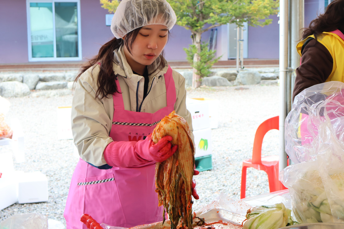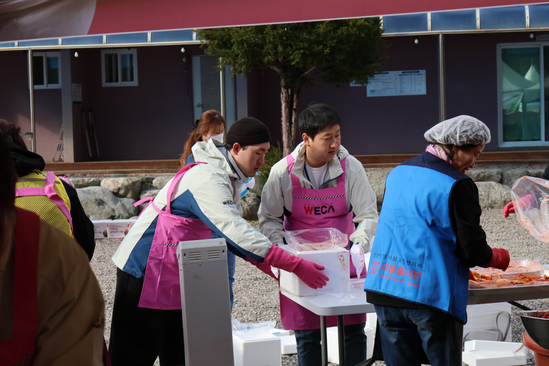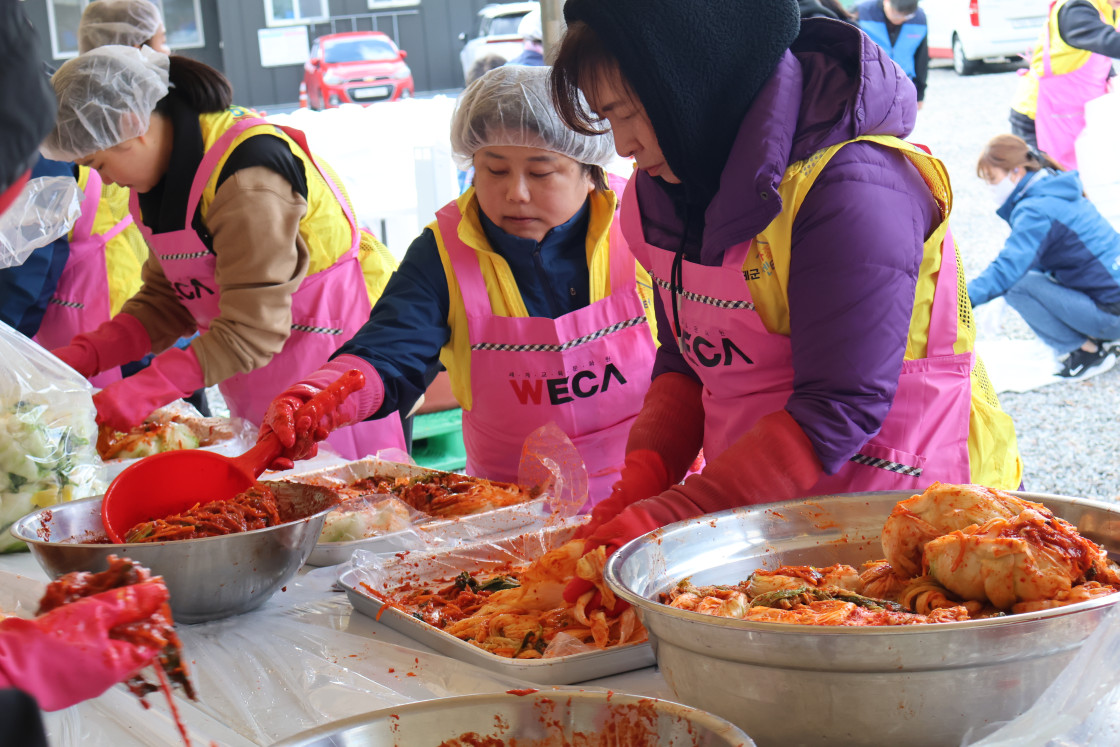 급작스러운 추위에 얼굴이 얼어붙은 11월, 세계교육문화원은 인제다문화가족센터와 함께 김장나눔 봉사를 진행했습니다. 직원들과 봉사자 일동은 추위 속에서도 수혜자들의 기뻐하는 모습을 생각하며 열심히 김치를 담갔습니다. 이번 김장김치 나눔 봉사에는 세계교육문화원 직원들을 비롯한 봉사자 40여 명이 참가하였는데요. 덕분에 김치 250박스, 총 1,250kg의 김치를 김장하여 인제의 농어촌, 다문화, 한부모, 조손가정 등 취약계층 가정에 전달할 수 있었습니다.