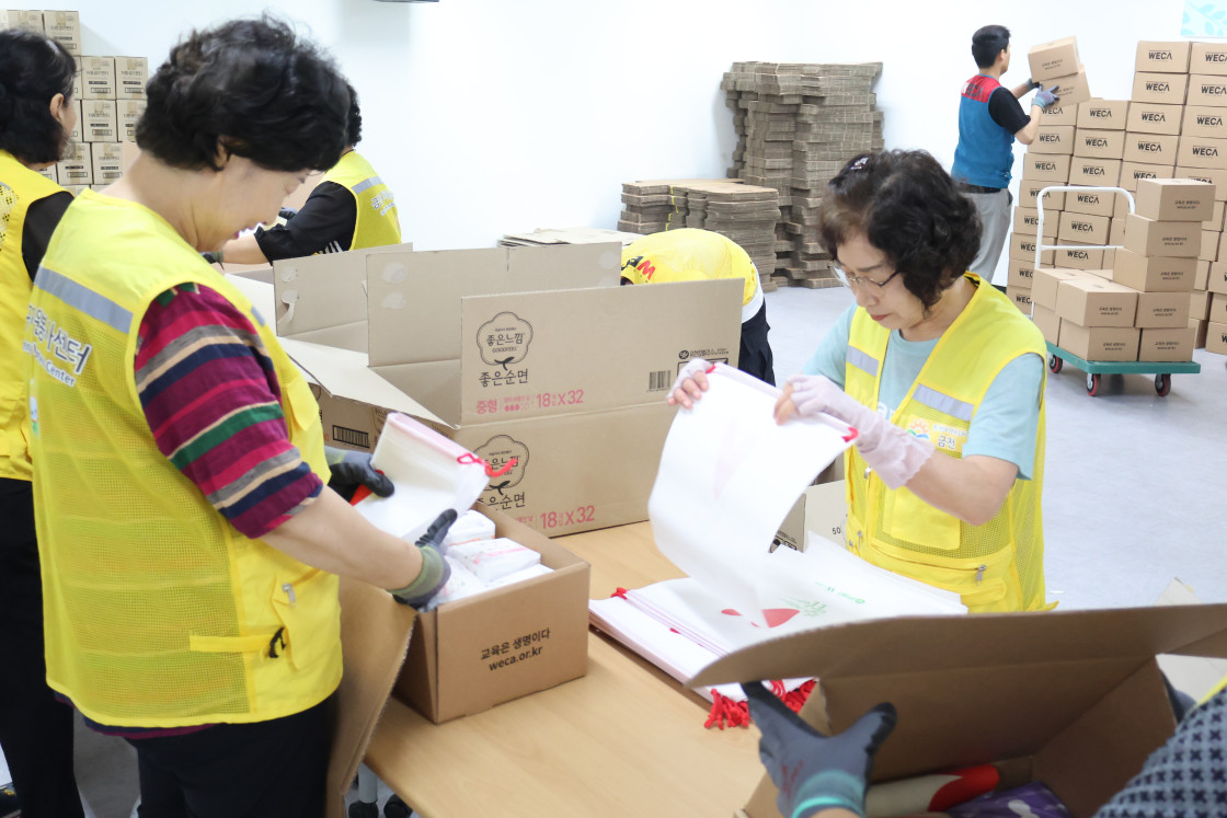 봉사자분들은 우리 딸이라고 생각하며, 정성껏 여성용품을 포장했습니다.