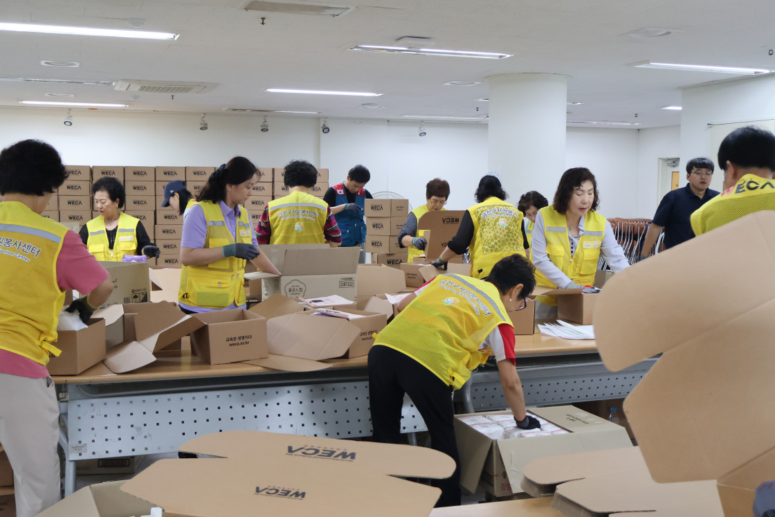 이번에는 유한킴벌리 '힘내라 딸들아' 여성용품 지원사업을 통해 여성용품 17만 패드를 국내 여성 청소년들에게 전달했는데요. 전달하기 전 상당한 양의 여성용품을 분배하고 포장하기 위해 많은 봉사자들이 모여 포장을 하였습니다.