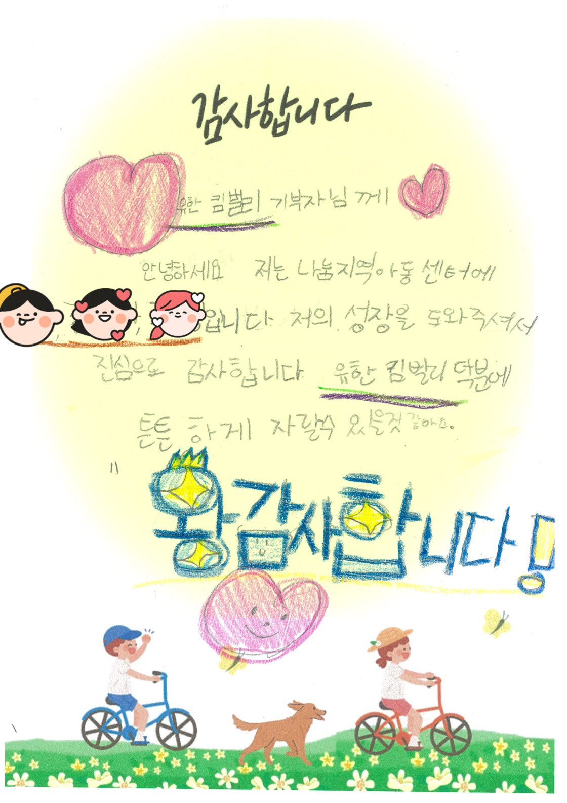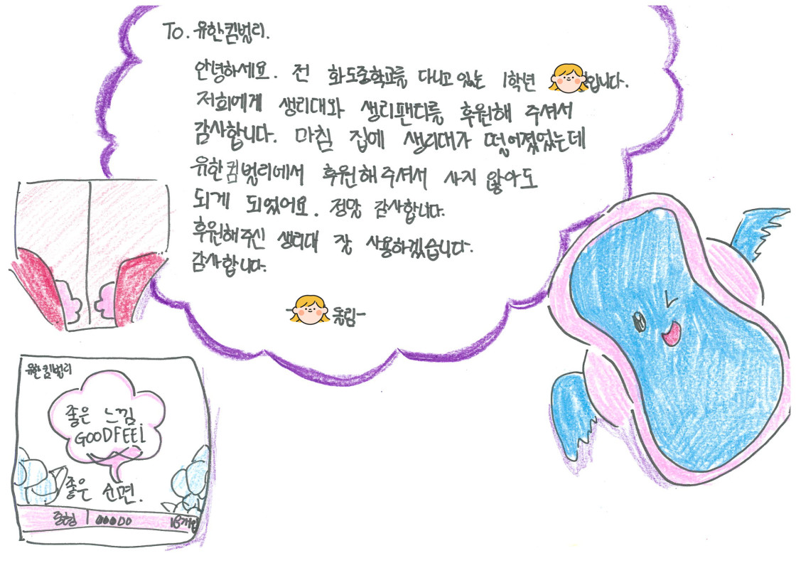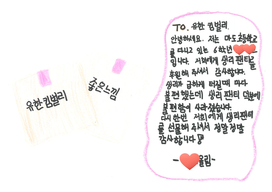 여성용품을 전달받은 청소년들이 감사편지를 손수 적어 보내주었답니다.