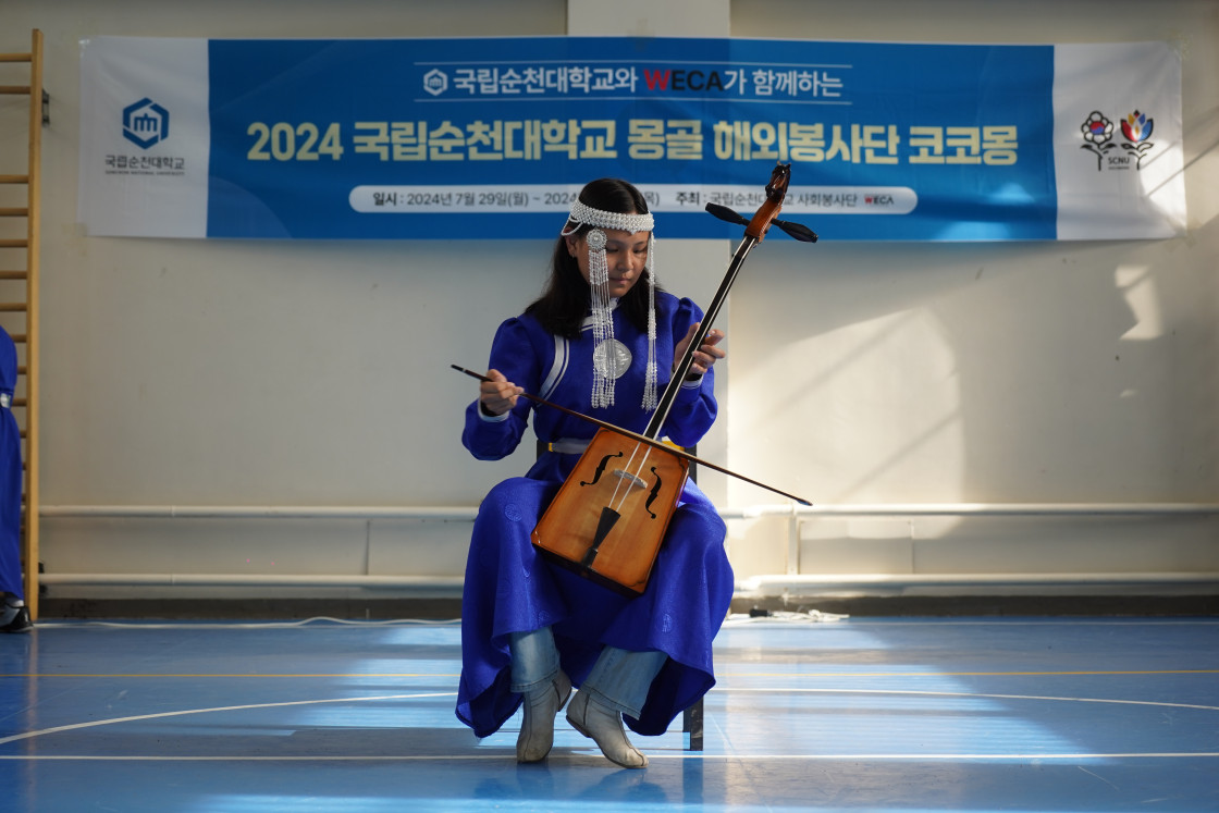 또한, 미니 운동회를 통해 몽골 아이들과 몸으로 교감하며 친밀감을 쌓고, 문화 교류의 시간을 가졌습니다. 몽골 아이들은 전통 춤과 악기 연주, 그리고 K-pop 댄스를 준비해 보여주었고, 국립순천대학교 봉사단 역시 K-pop 공연과 태권무를 선보였습니다. 특히, 태권무 공연 중 텀블링, 발차기, 격파 시범이 이어지자 몽골 아이들은 열광적인 반응을 보였습니다.