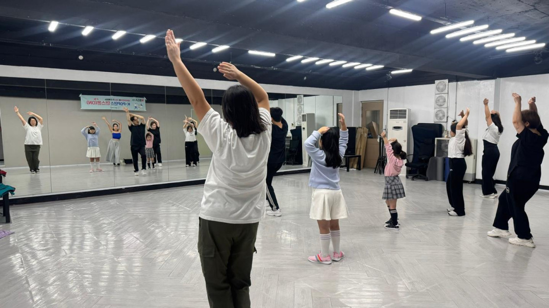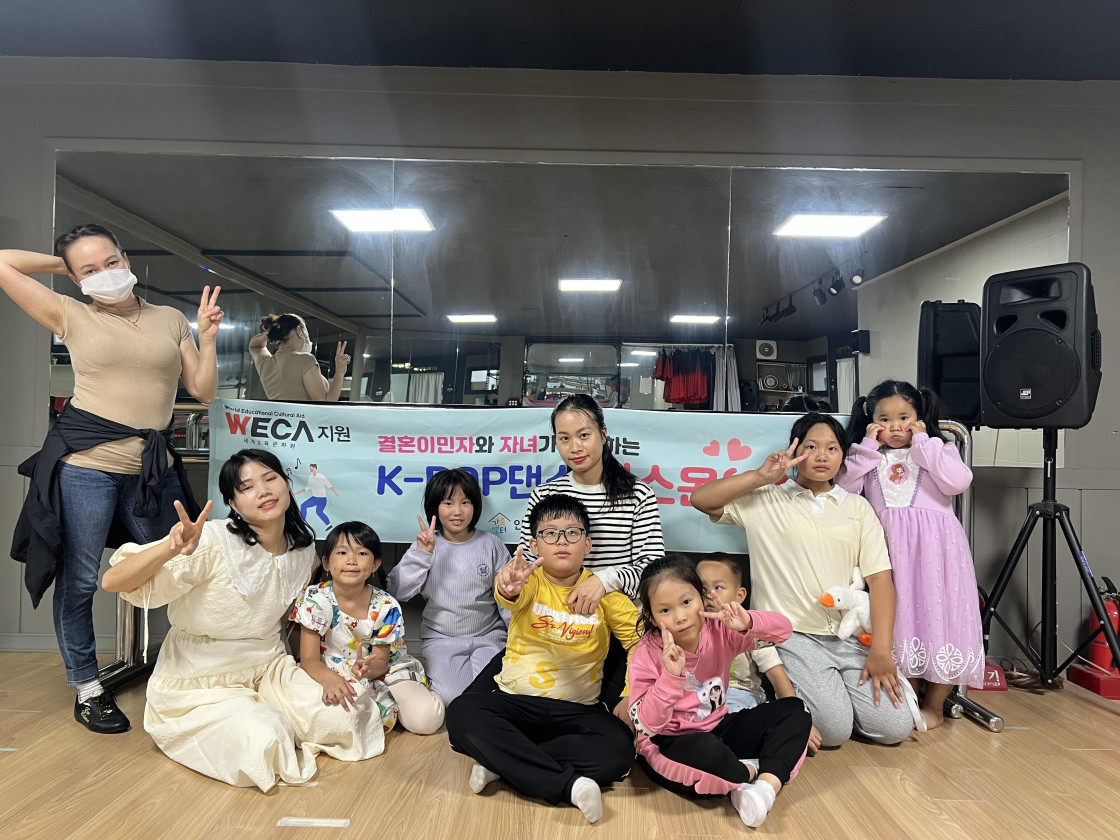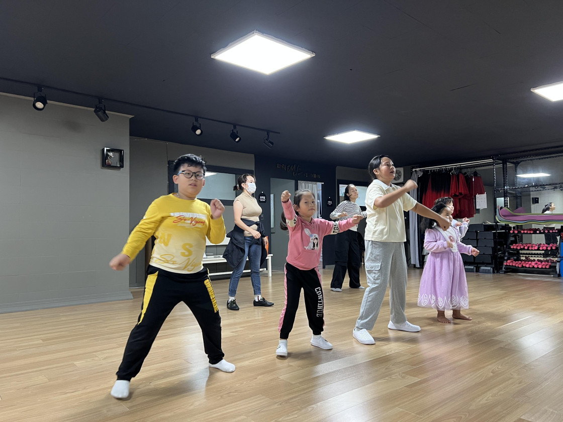 결혼이민자와 자녀들이 K-POP 음악에 맞춰 춤을 배우고 있어요.