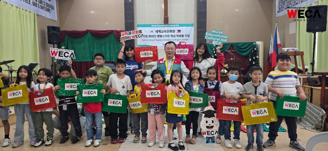 세계교육문화원 동남아시아 출장팀은 필리핀 신규 사업지인 바타안 엔젤스가든 학교를 방문해 152명의 학생들에게 학용품을 전달했습니다. 알록달록한 WECA 가방들이 강당 가득 놓여 있었고, 아이들은 새로운 학용품을 받아 들고 환한 미소를 지었습니다.