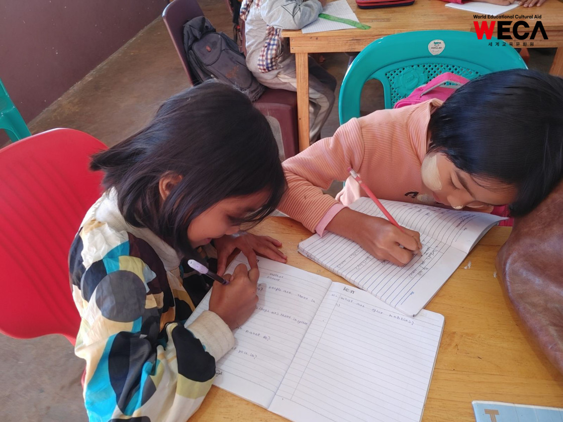 미얀마는 여전히 교사와 교재 부족, 불안정한 학습 환경 등으로 인해 많은 아이들이 제대로 된 교육을 받기 어려운 현실에 놓여 있습니다. 배움의 기회가 적어질수록 아이들의 미래도 함께 좁아지는 상황 속에서, 세계교육문화원(WECA)은 아이들에게 다시 ‘배울 수 있는 기회’를 제공하는 일을 가장 시급한 과제로 여기고 어학당과 방과후교실을 운영하고 있습니다.