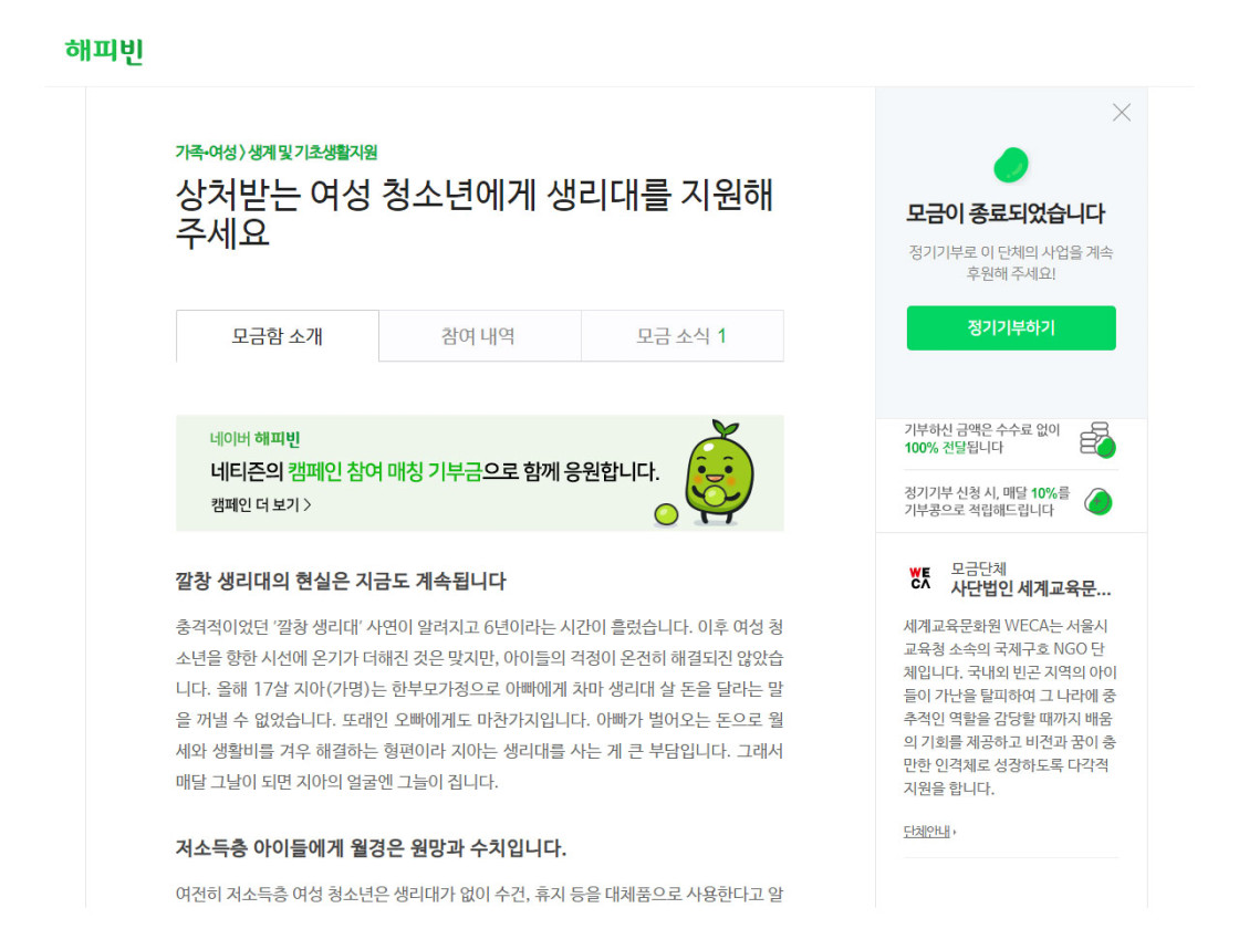 어려움을 겪는 저소득층 여성 청소년의 사연에 많은 후원자님이 공감해주셨습니다. 해피빈 후원자님들로부터 9,507,400원의 후원금이 도착했고, 글로벌 뷰티 브랜드 랑콤에서 매칭 기부금으로 4,000,000원의 후원금을 전해주셨습니다. 이렇게 총 13,507,400원의 후원금이 모였으며 국내 저소득가정 여성 청소년 590명을 위한 생리대 키트를 준비할 수 있었습니다.