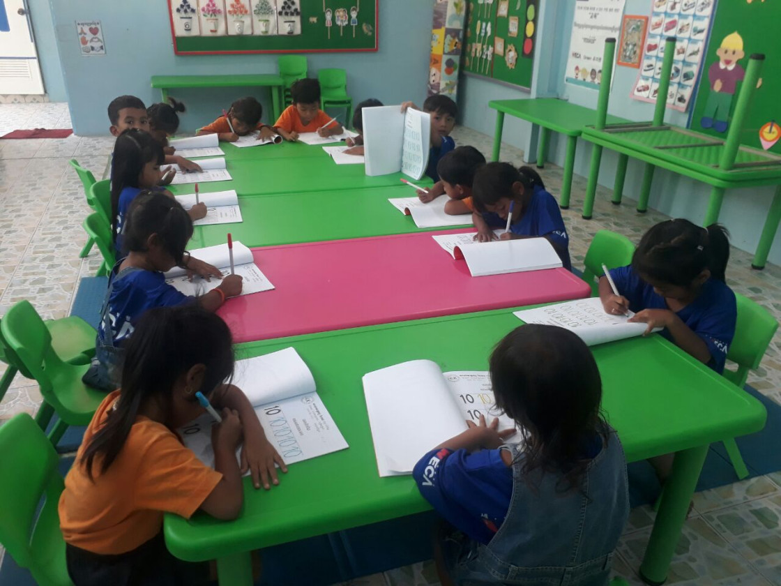 우기로 인하여 등하교에 어려움이 있는 가운데서도 유치원 아이들은 수업을 재미있어하며 결석 한 명 없이 수업에 참여하고 있습니다.