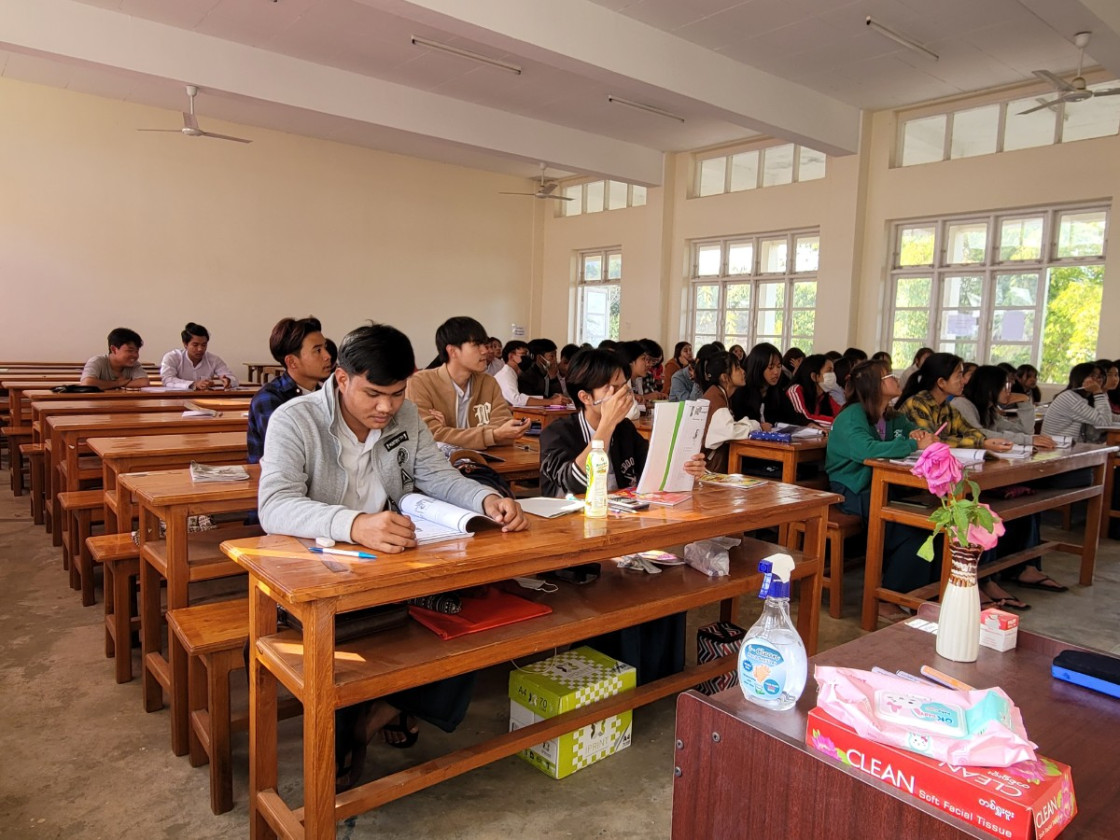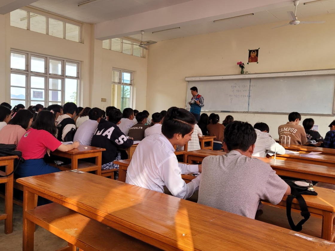 2022학년도 신입생 기초반 55명을 대상으로 미얀마 따웅지 컴퓨터대학교 한국어 교실에서 한국어 수업을 진행했습니다. 한국말로 인사하기, 자기소개하기, 친구 소개하기, 유용한 단어 등을 배웠고 아이들은 처음에는 어려워 했지만, 수업 후반부에는 귀여운 발음이라며 즐거워했습니다. 아이들이 수업에 집중하는 모습이 참 기특해 보였습니다.