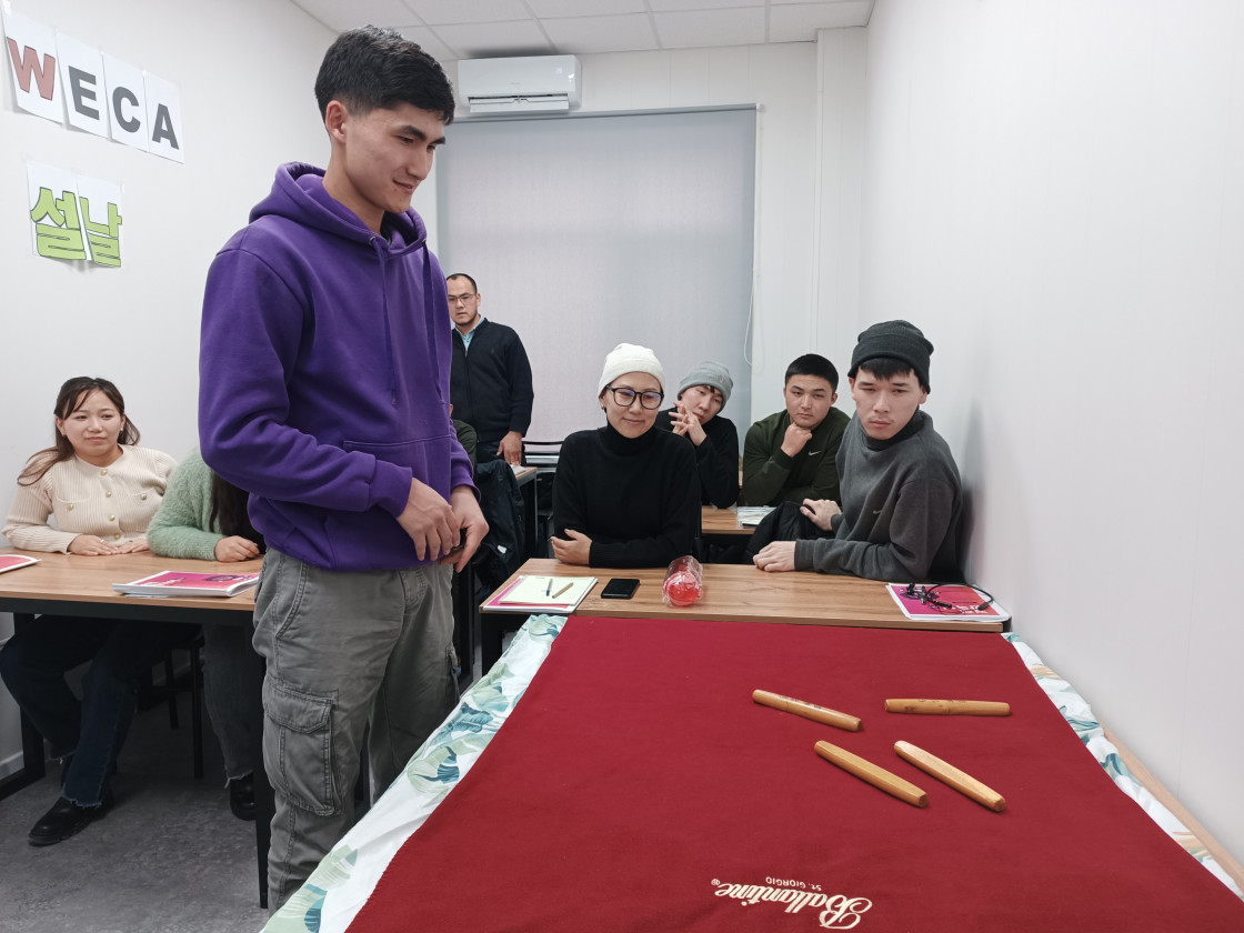 현재 키르기스스탄 WECA 어학당에는 24명의 학생들이 수업을 듣고 있습니다. 한국의 민족 대 명절인 설날을 맞아, 어학당 학생들도 설날의 문화를 체험하는 시간을 가졌는데요. 생소하지만 즐거운 전통 놀이와 맛있는 떡국을 먹으며 학생들은 한국의 문화에 대해 더 큰 호기심을 느끼고 더 열심히 한국어를 배워야겠다며 학구열을 불태웠습니다.