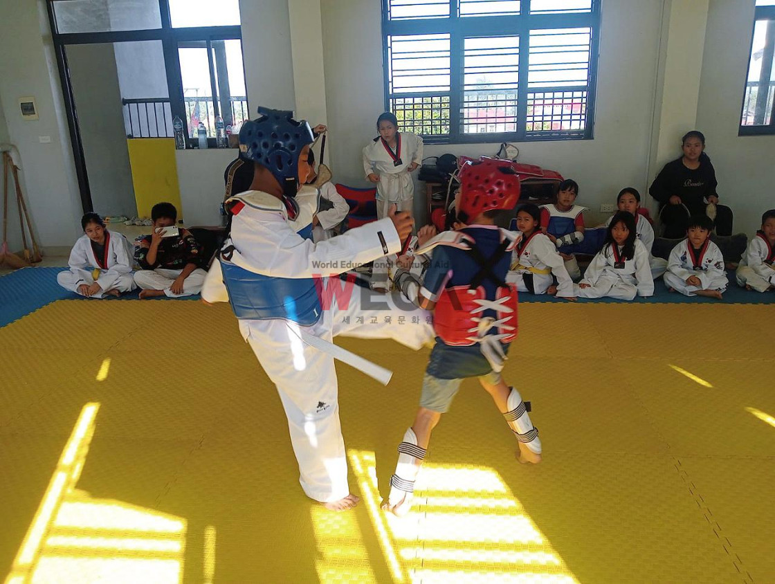 태권도를 좋아하는 라오스 아이들은 방학 기간에도 빠지지 않고 수업에 나와 태권도 연습을 하고 있습니다. 50여 명의 학생들은 씩씩하게 기합을 내지르며 품새를 익히는데 집중하고 있습니다. 아이들은 안전하게 태권도 보호대를 입고 겨루기도 하였습니다. 규칙을 잘 지키며 겨루기를 잘 마친 아이들이 기특합니다.