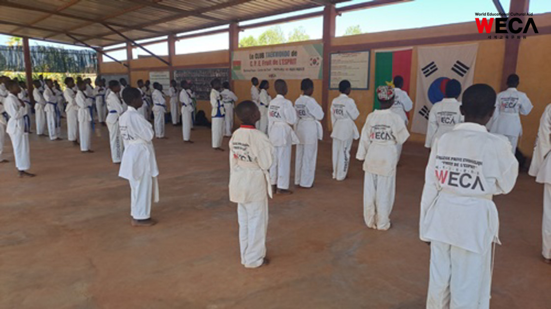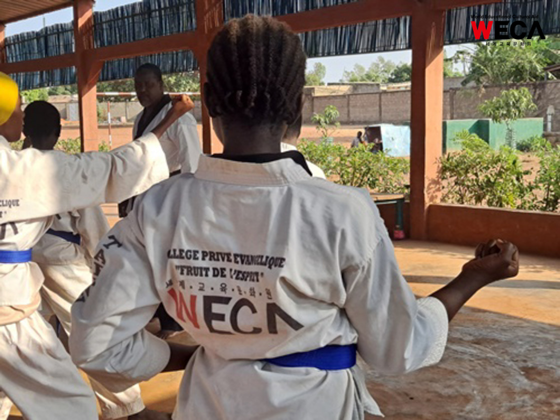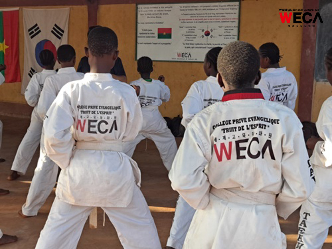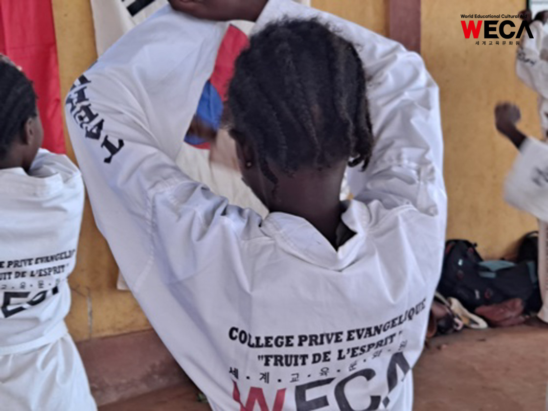 부르키나파소에서는 스포츠·문화교육의 기회가 매우 제한적이어서 아이들이 기초 체력, 바른 자세, 자기보호 능력을 배울 수 있는 환경이 충분하지 않습니다. 이러한 배경 속에서 운영되고 있는 WECA 태권도교실은 아이들에게 몸과 마음을 성장시킬 수 있는 귀중한 배움의 시간이 되고 있습니다. 현재는 중등 1·2학년과 상급 희망자를 포함해 약 120명의 학생들이 주 2회(수·토) 태권도 수업에 참여하고 있습니다. 수요일에는 하급반 수업을 중심으로 진행되었고, 유아반 15명도 함께 배우며 활기찬 시간을 보냈습니다. 수업에서는 기본 소양 교육부터 바른 자세 교정, 기본기, 호신술까지 폭넓게 지도하고 있으며, 신체적 기본자세가 부족한 학생들은 개별 교정을 통해 점차 성장해 가고 있습니다.