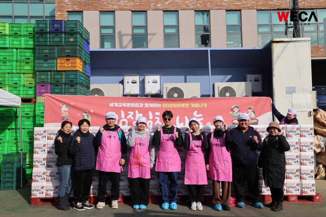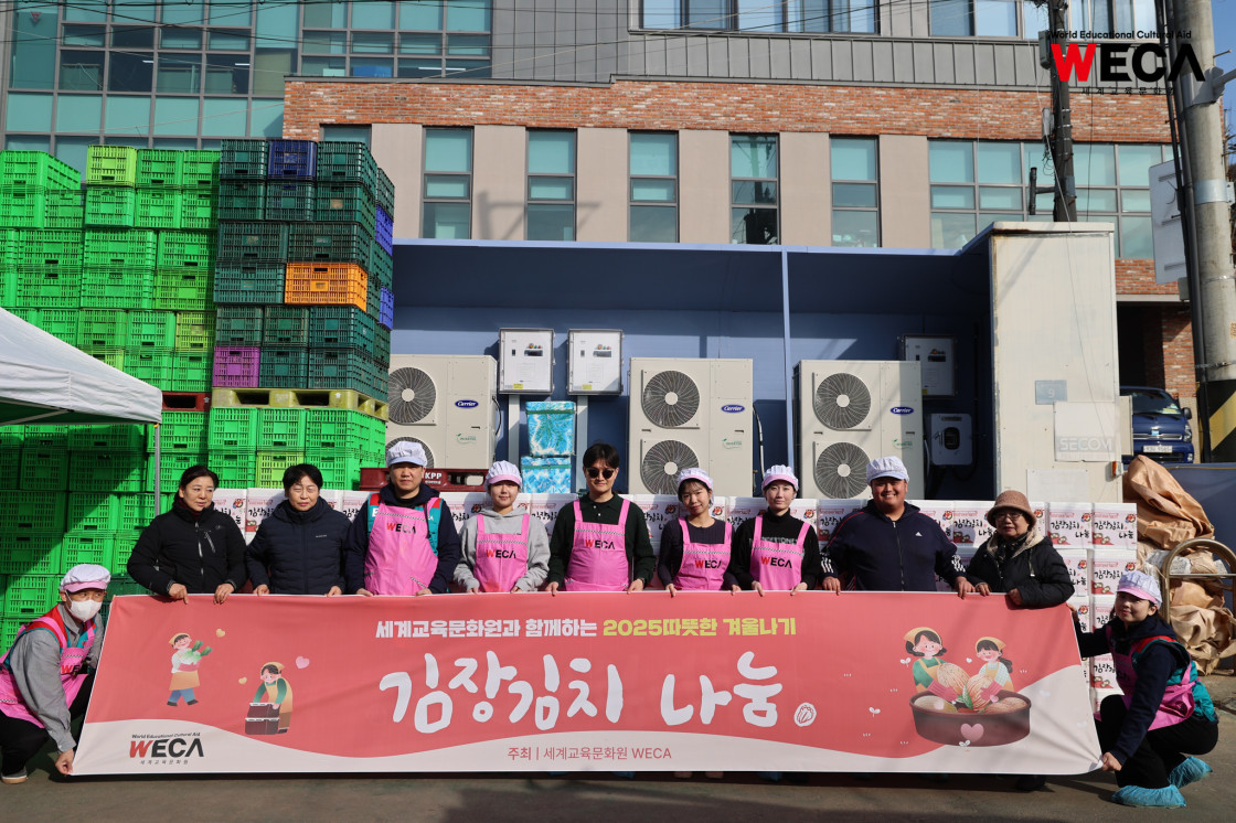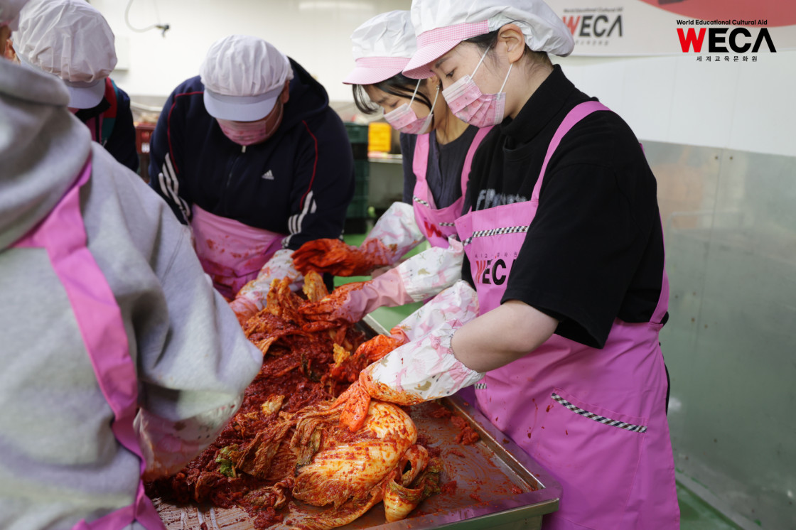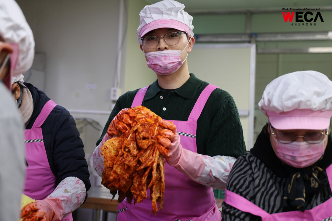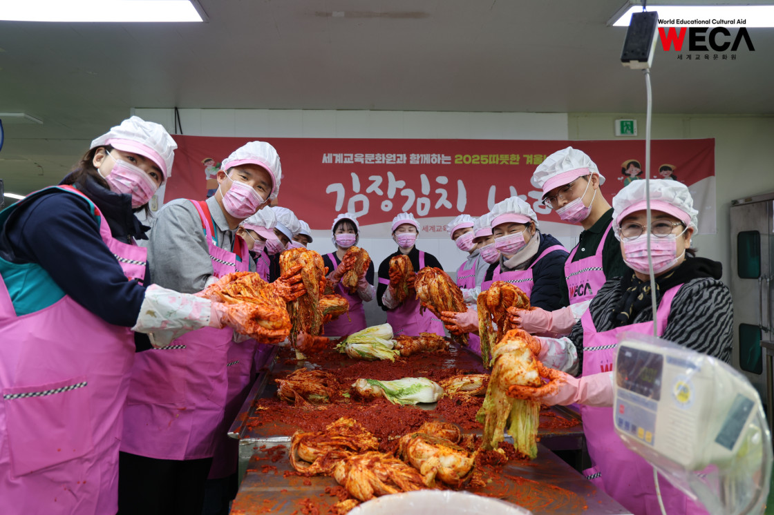 세계교육문화원은 인천 연수구에서 WECA와 함께 담그는 사랑의 2025 김장나눔 봉사활동을 진행했습니다. 이번 활동은 겨울철 반찬이 부족해 끼니를 챙기기 어려운 다문화가정과 장애인 가정에 따뜻한 식탁을 전하고, 나눔의 가치를 함께 실천하기 위해 마련되었습니다. 이날 현장에는 WECA 임직원과 서포터즈, 자원봉사자 등 총 13명이 참여했습니다. 봉사자들은 사전 오리엔테이션을 통해 김장 봉사의 취지와 위생 수칙을 공유한 뒤, 위생모와 앞치마를 착용하고 절인 배추에 김장 속을 버무리고 포장하는 작업에 정성껏 임했습니다.