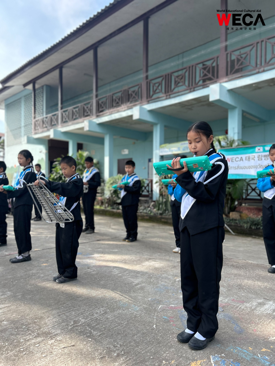 태국 반던탐 지역에서 WECA의 지원으로 운영되고 있는 반던탐 학교 합주부가 출장팀을 맞이하기 위해 약 15분간의 환영 공연을 준비했습니다. 문화교육의 기회가 거의 없던 시골 마을에서 아이들이 직접 악기를 연주하며 무대에 서는 모습은, 그 자체로 큰 감동을 전했습니다.