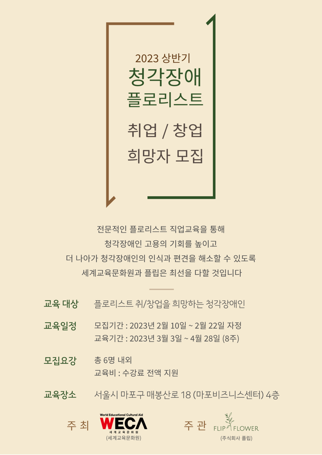 전문적인 플로리스트 직업교육을 통해 청각장애인 고용의 기회를 높이고 더 나아가 청각장애인의 인식과 편견을 해소할 수 있도록 세계교육문화원과 플립은 최선을 다할 것입니다.