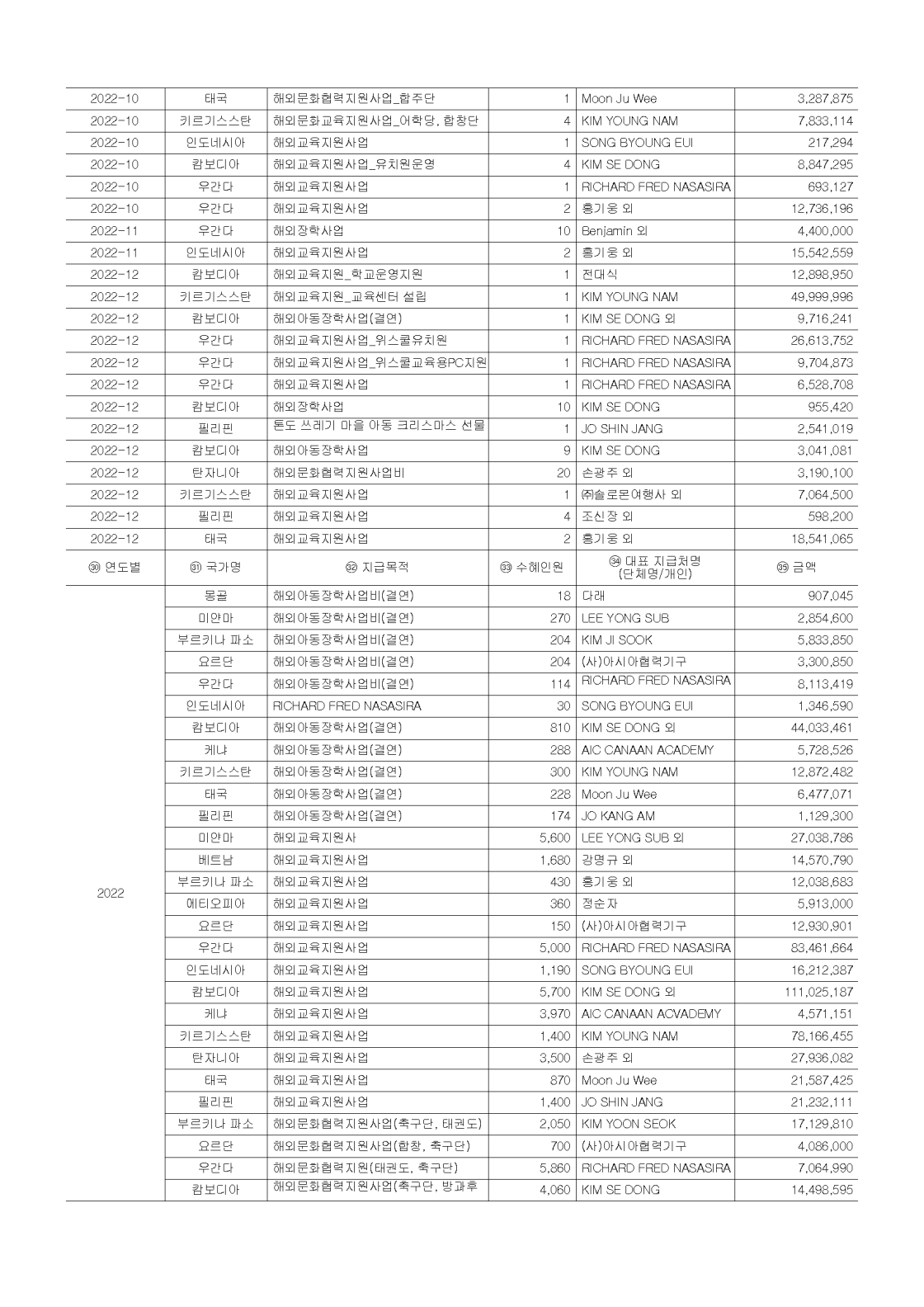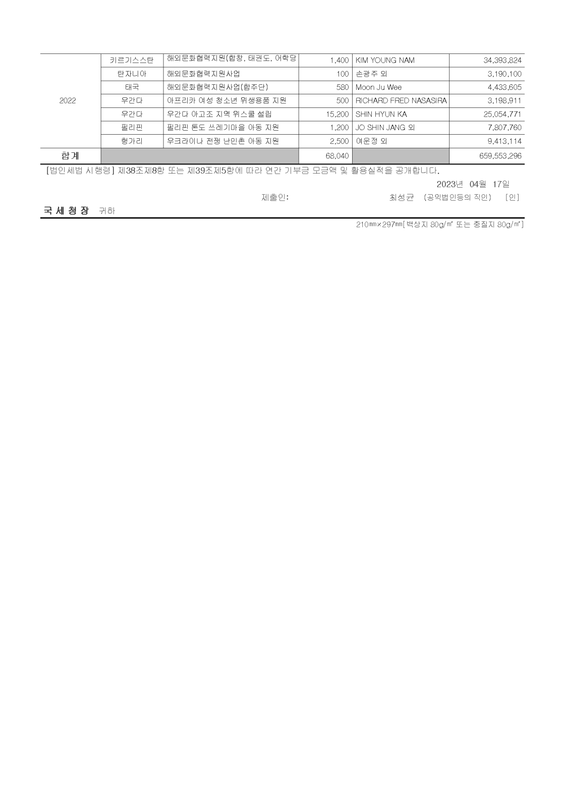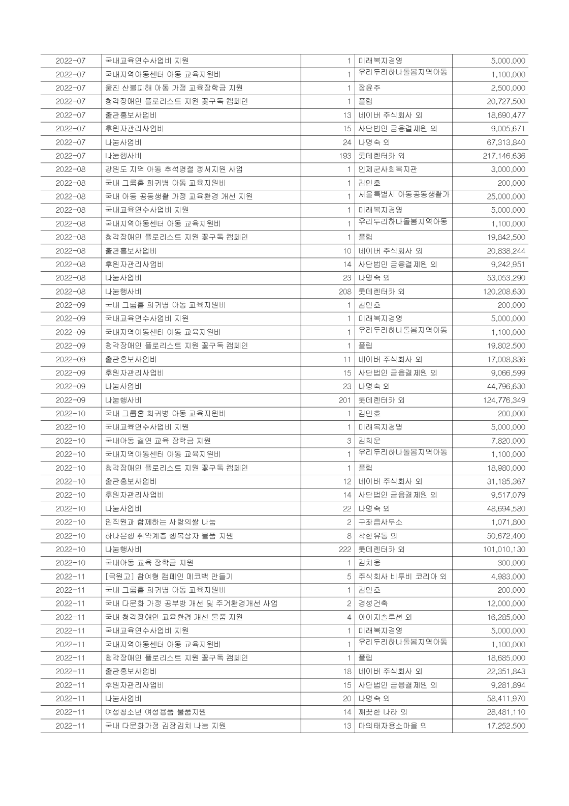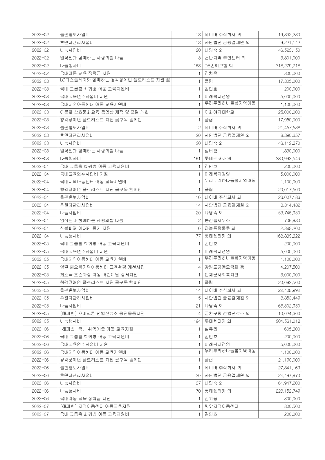 2022년 공개 보고서 기부금 모금액 및 활용실적 명세서
