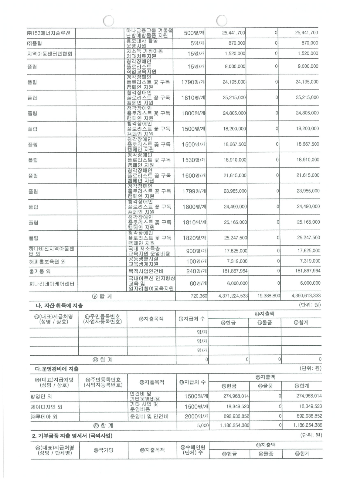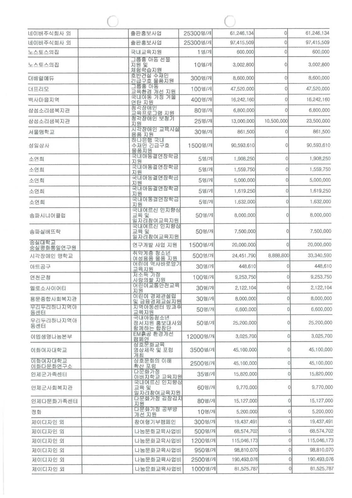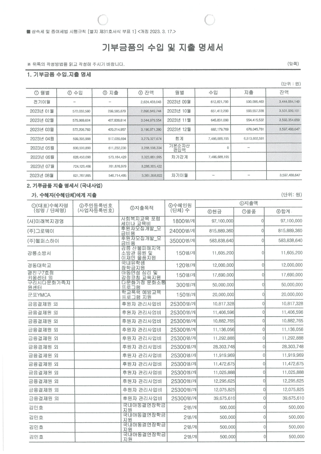 2023년 공개 보고서 기부금품 수입 지출 명세서