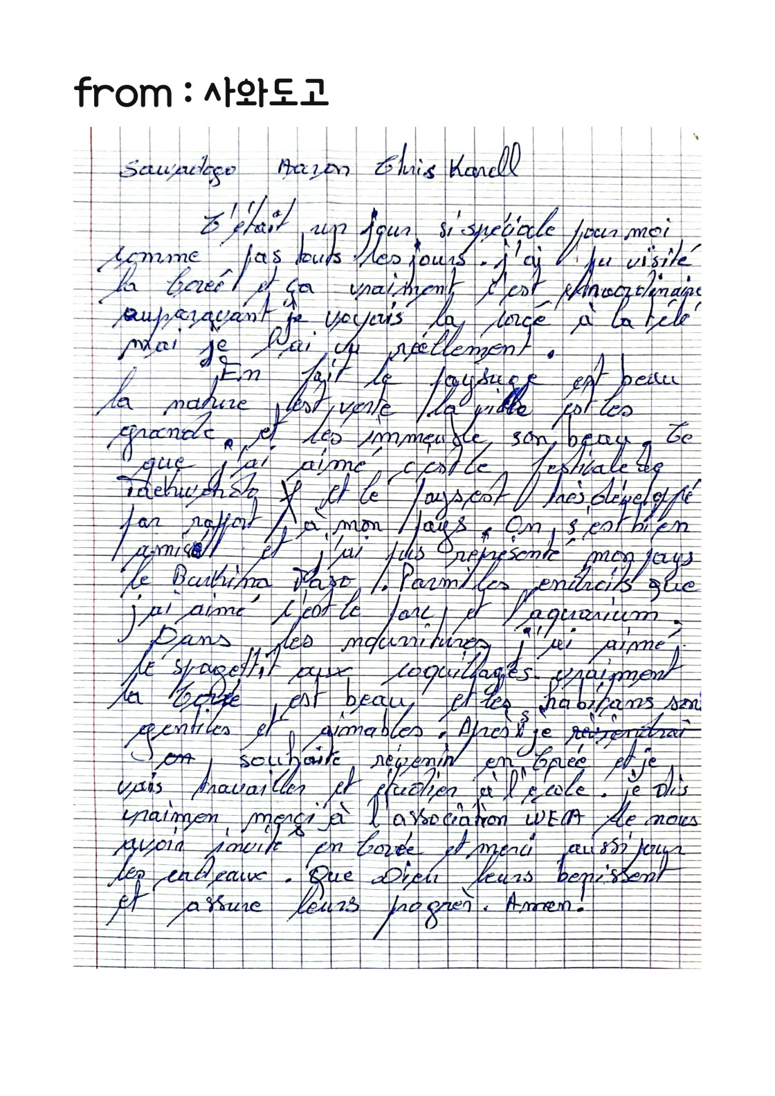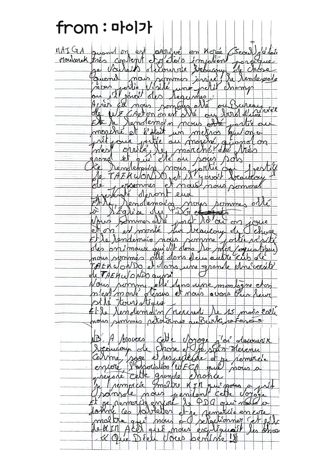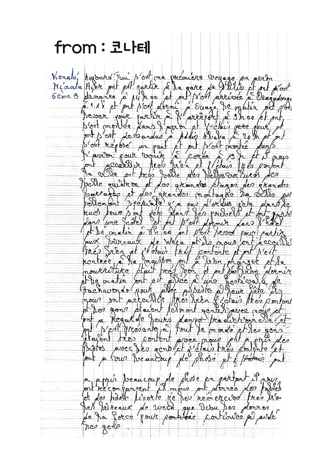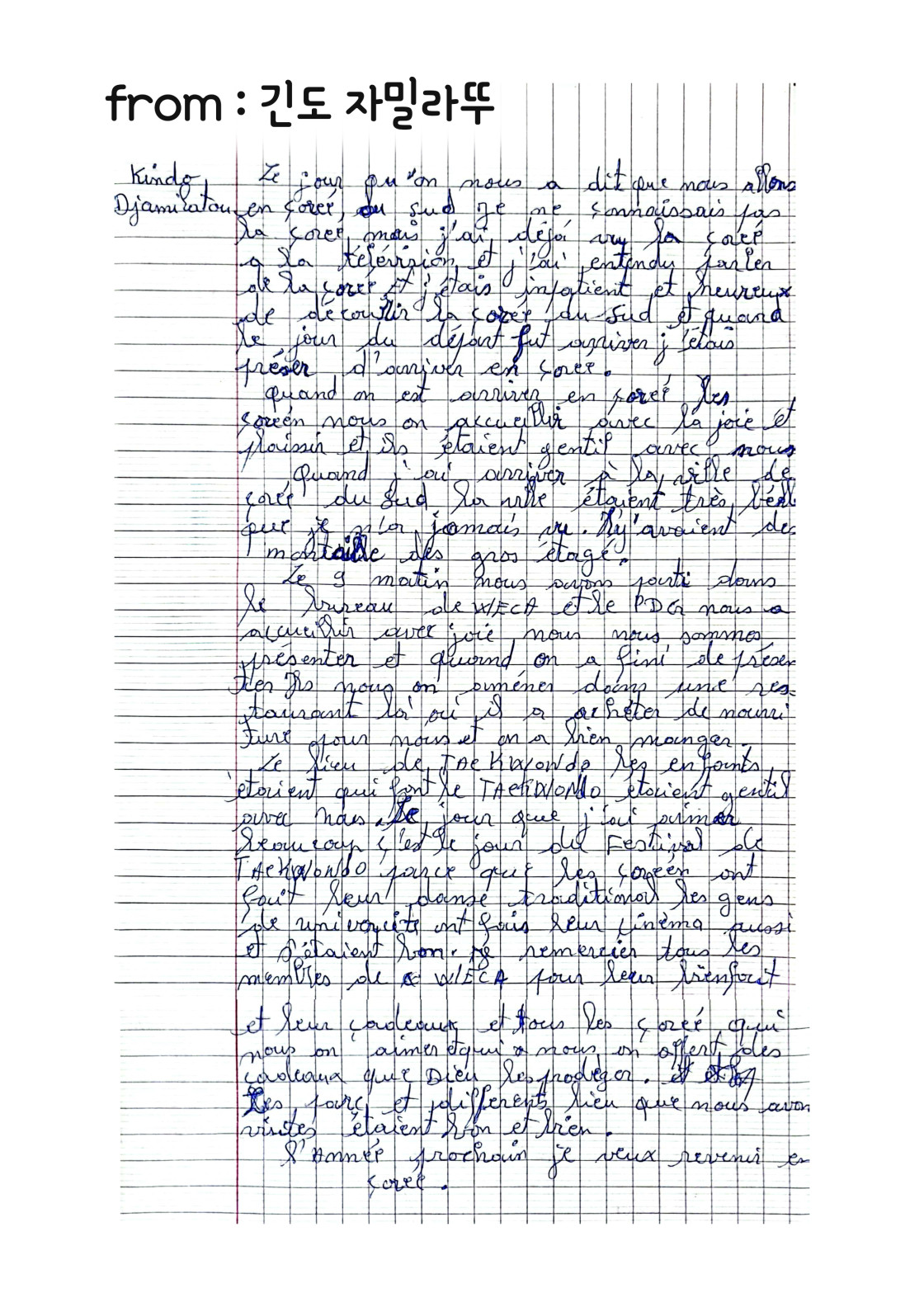 이전에 저는 한국을 잘 몰랐지만, TV에서 한국을 보고, 사람들이 한국에 대해 이야기하는 것을 들었습니다. 한국에 방문하게 되어 조급하고 기뻤으며 처음 한국에 도착했을 때 부르키나파소와 많이 다른 모습에 엄청 놀랐습니다. 그리고 한국인들은 우리를 기쁨과 즐거움으로 환영해 주었고 친절하게 대해주었어요.