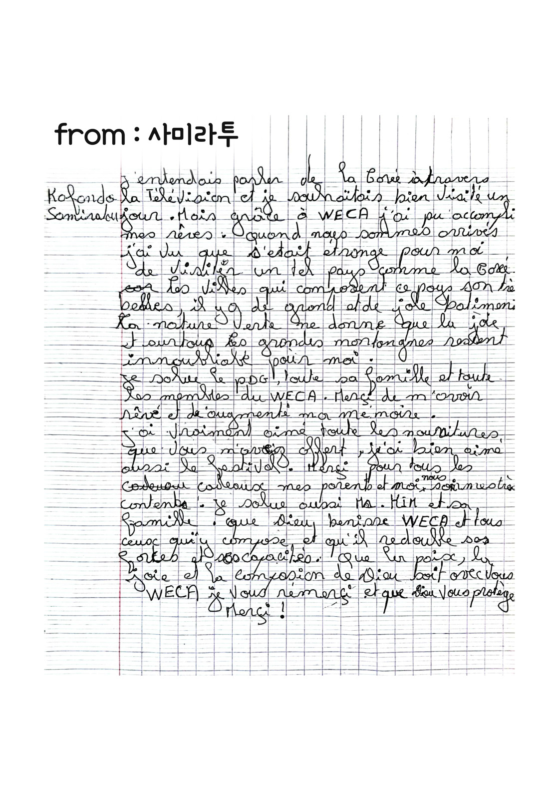 전에 텔레비전에서 한국을 보고 언젠가 꼭 가보고 싶었어요. 이번에 WECA 덕분에 저는 제 꿈 중 하나를 이룰 수 있었습니다. 도착했을 때 저는 무슨 일이 일어나고 있는지 실감이 나질 않았어요. 제가 한국이라는 나라를 방문한다는 건 참 놀라운 일입니다. 이 나라를 구성하는 도시들은 매우 아름답고, 크고 예쁜 건물들이 있습니다. 푸른 자연은 누구에게나 기쁨을 선사하고, 푸른 산은 나에게 잊지 못할 추억으로 남아있습니다.
