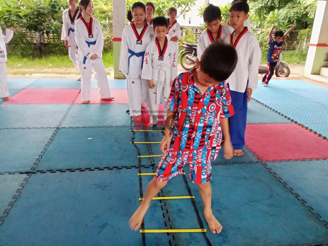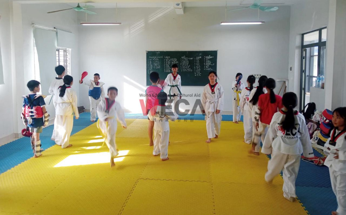 태권도를 좋아하는 라오스 아이들은 방학 기간에도 빠지지 않고 수업에 나와 태권도 연습을 하고 있습니다. 50여 명의 학생들은 씩씩하게 기합을 내지르며 품새를 익히는데 집중하고 있습니다. 아이들은 안전하게 태권도 보호대를 입고 겨루기도 하였습니다. 규칙을 잘 지키며 겨루기를 잘 마친 아이들이 기특합니다.