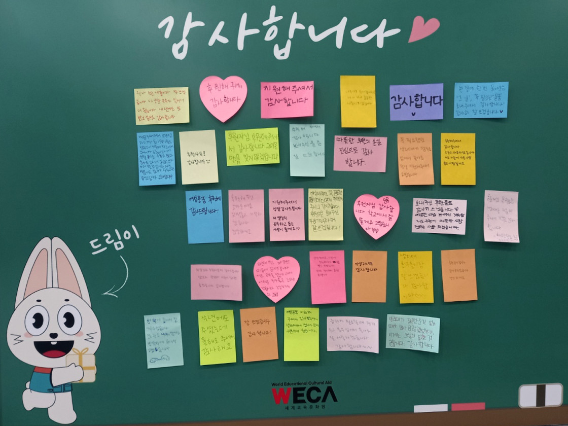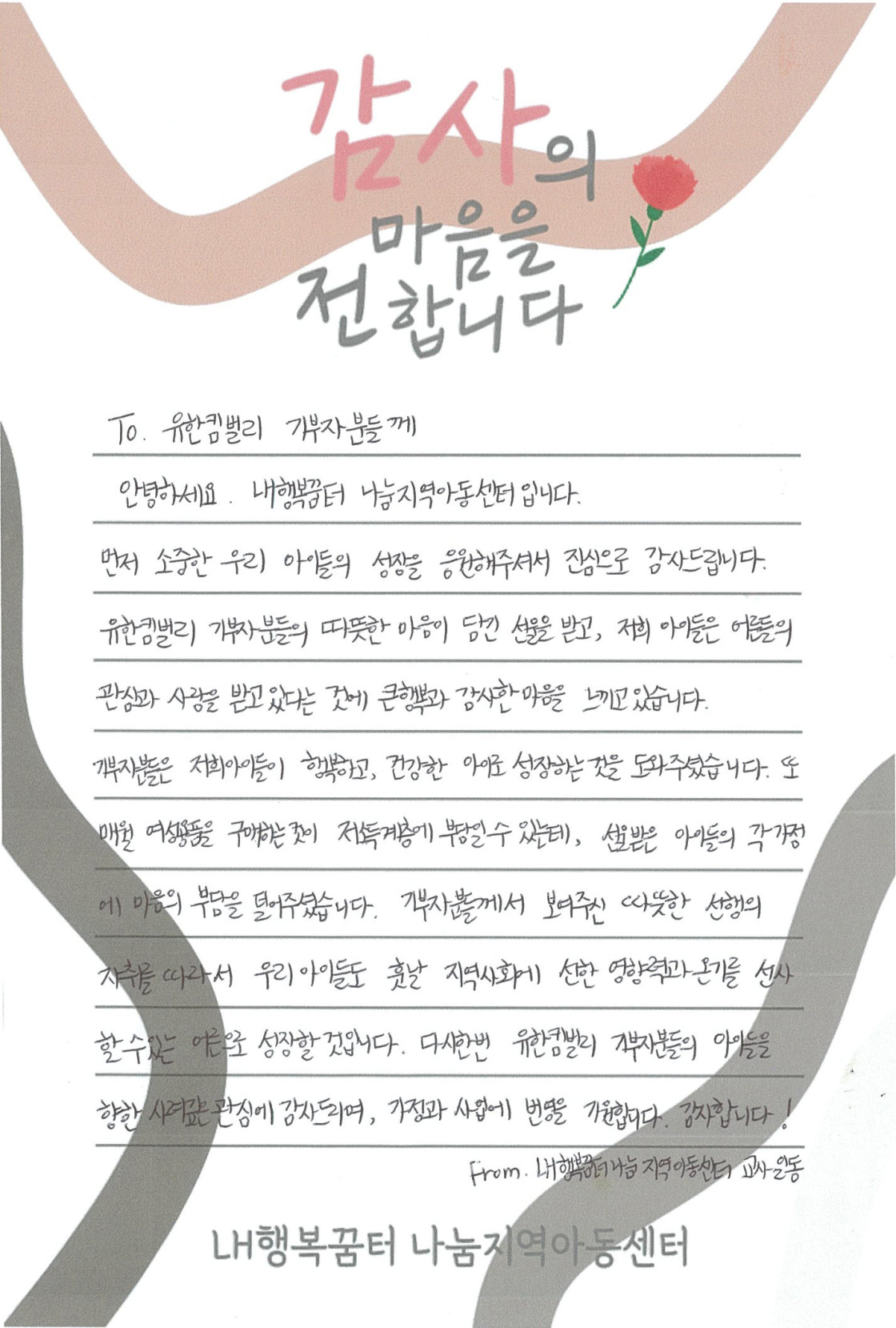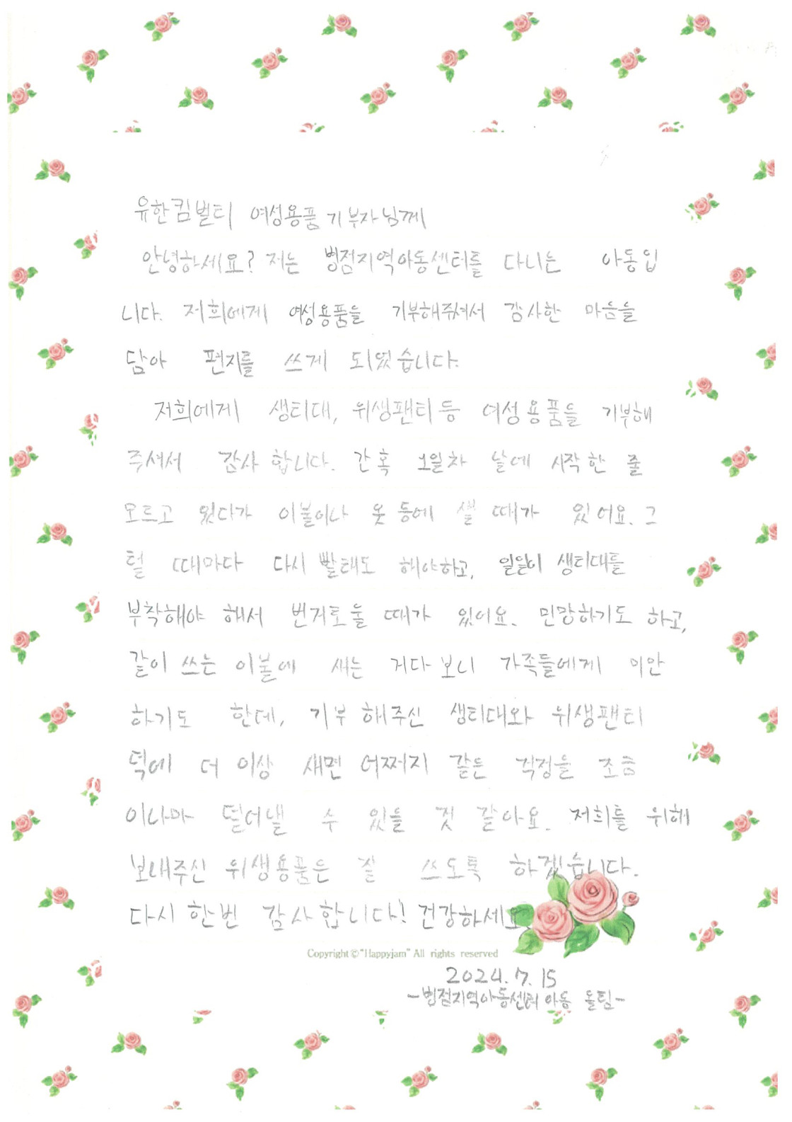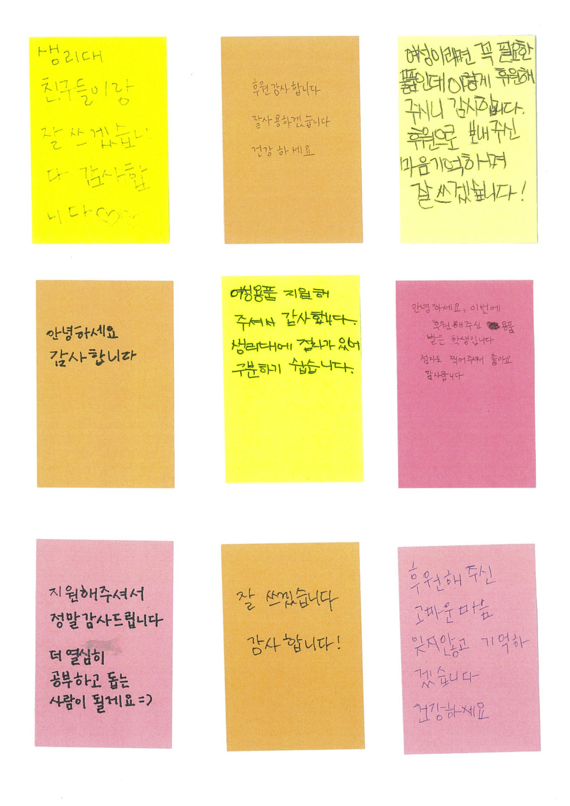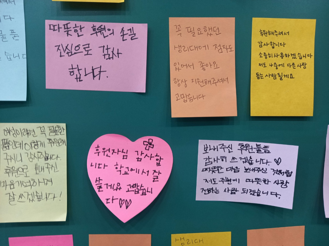 여성용품을 전달받은 청소년들이 감사편지를 손수 적어 보내주었답니다.