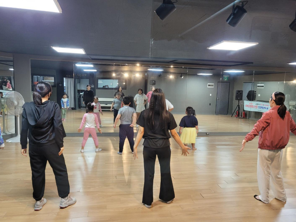 결혼이민자와 자녀들이 K-POP 음악에 맞춰 춤을 배우고 있어요.