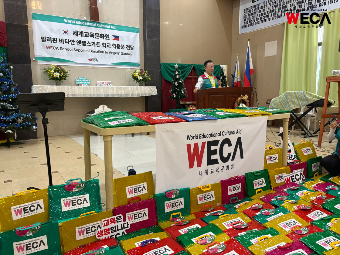 세계교육문화원 동남아시아 출장팀은 필리핀 신규 사업지인 바타안 엔젤스가든 학교를 방문해 152명의 학생들에게 학용품을 전달했습니다. 알록달록한 WECA 가방들이 강당 가득 놓여 있었고, 아이들은 새로운 학용품을 받아 들고 환한 미소를 지었습니다.