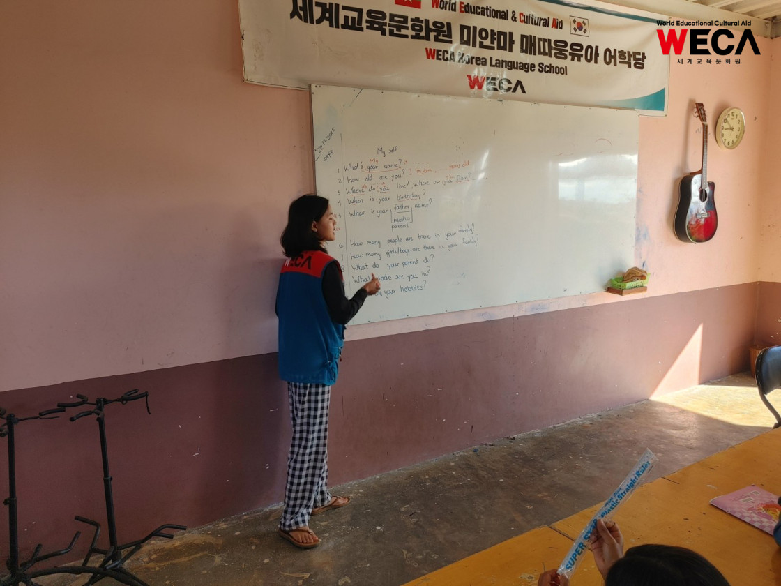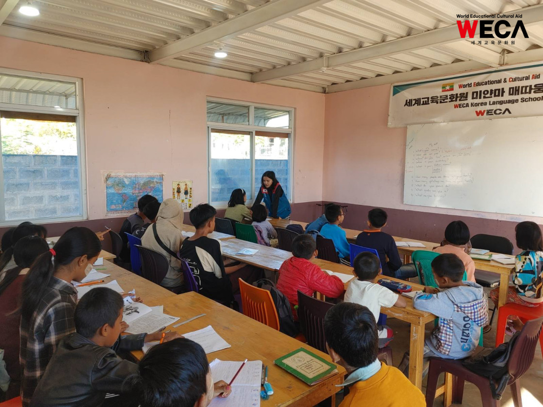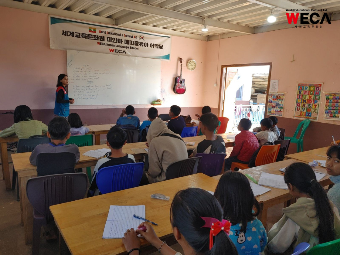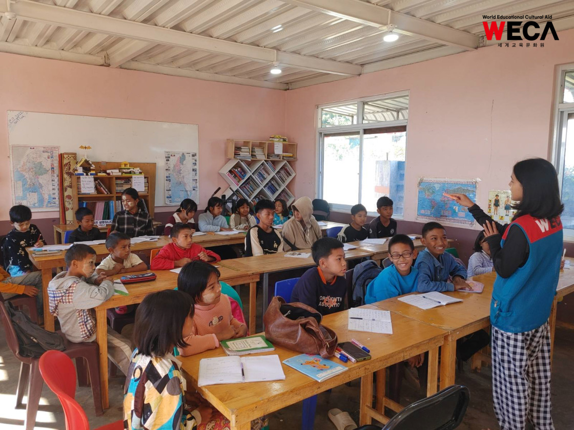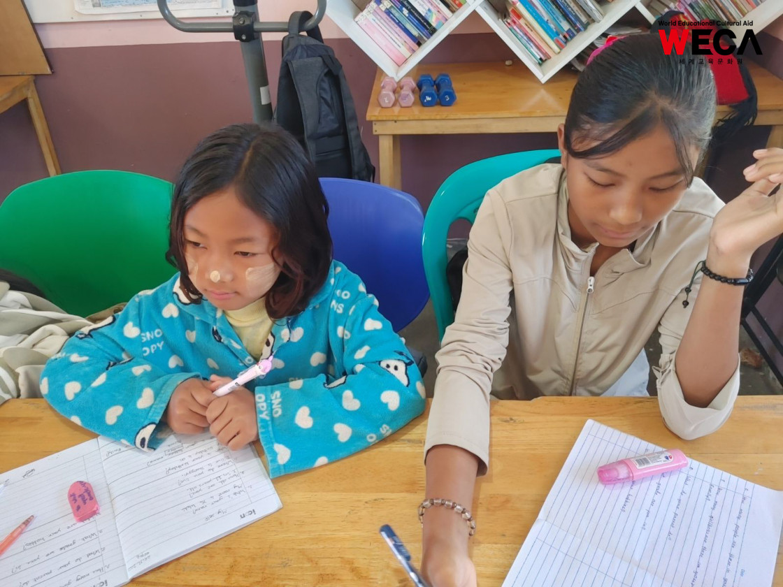 미얀마는 여전히 교사와 교재 부족, 불안정한 학습 환경 등으로 인해 많은 아이들이 제대로 된 교육을 받기 어려운 현실에 놓여 있습니다. 배움의 기회가 적어질수록 아이들의 미래도 함께 좁아지는 상황 속에서, 세계교육문화원(WECA)은 아이들에게 다시 ‘배울 수 있는 기회’를 제공하는 일을 가장 시급한 과제로 여기고 어학당과 방과후교실을 운영하고 있습니다.