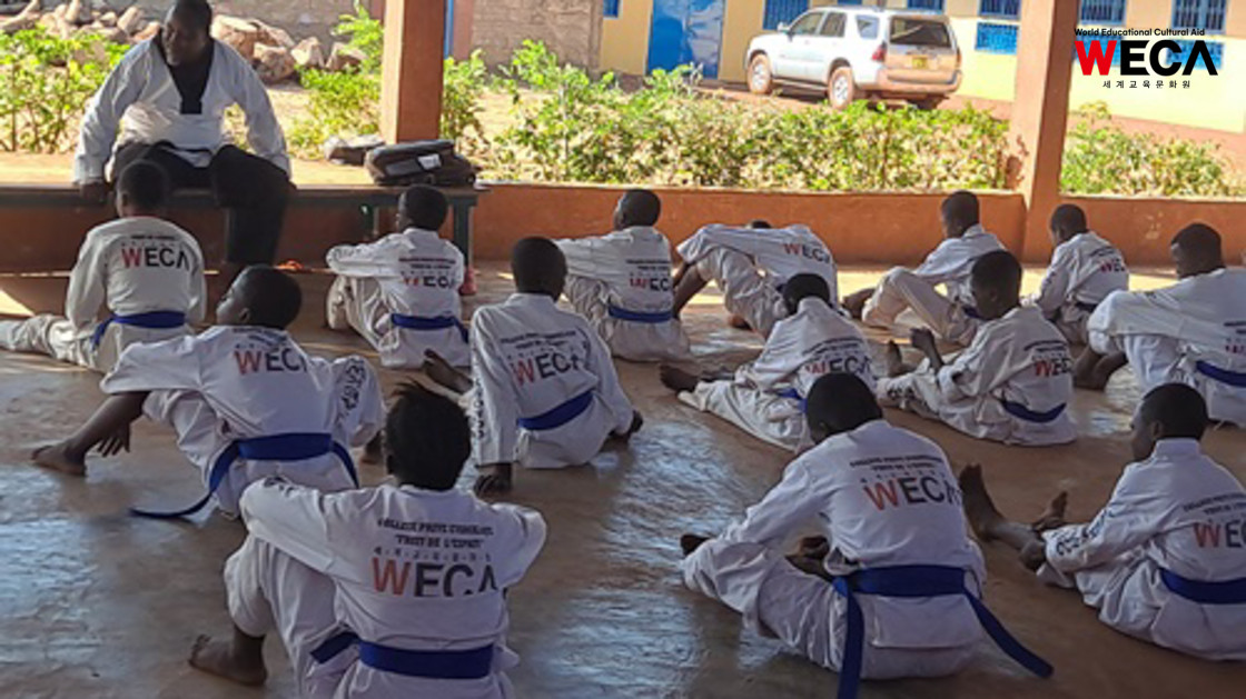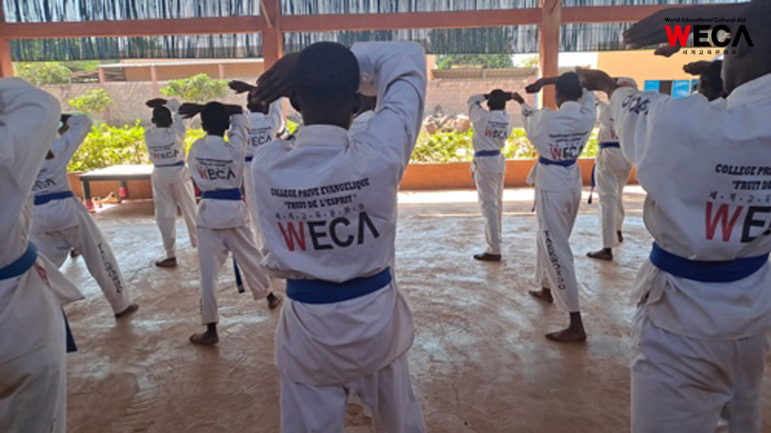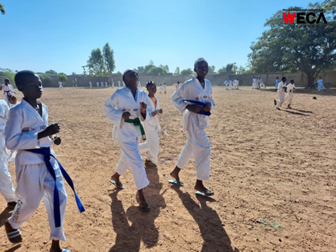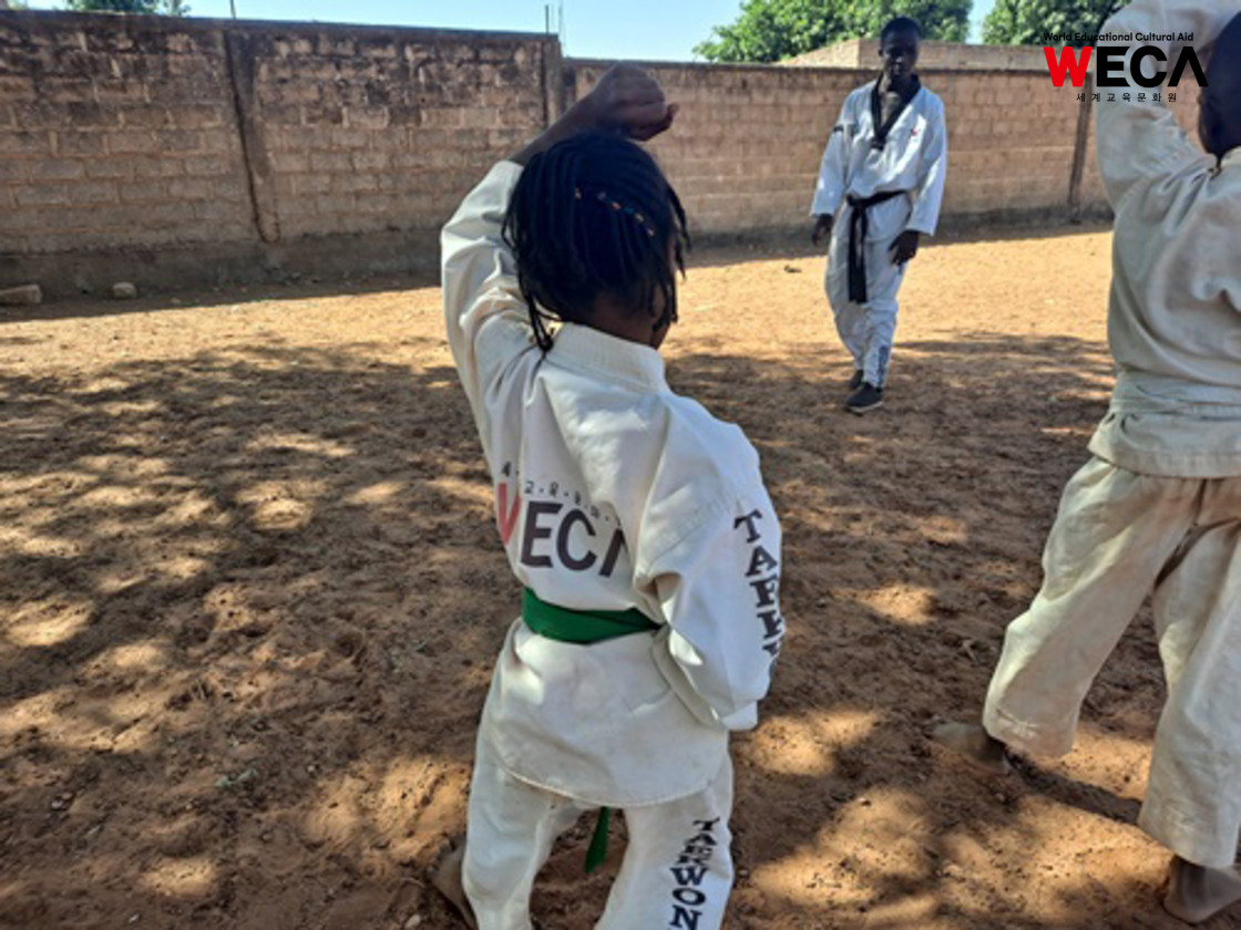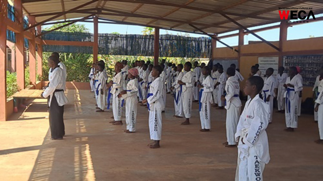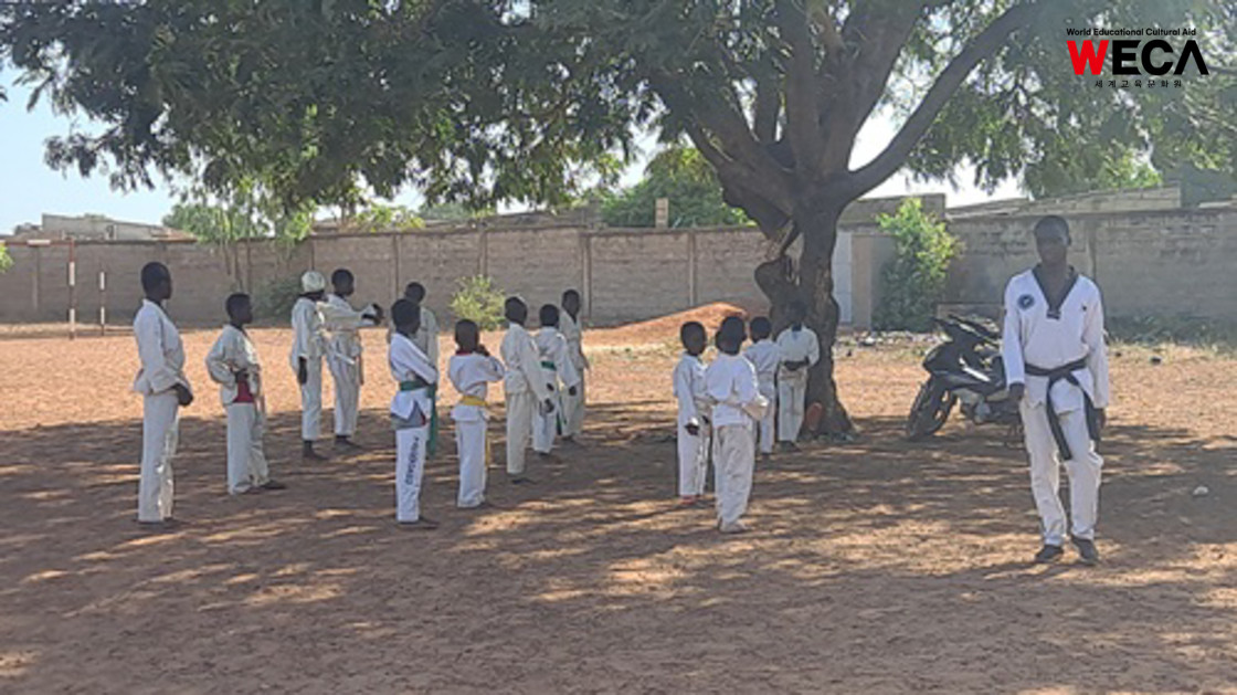부르키나파소에서는 스포츠·문화교육의 기회가 매우 제한적이어서 아이들이 기초 체력, 바른 자세, 자기보호 능력을 배울 수 있는 환경이 충분하지 않습니다. 이러한 배경 속에서 운영되고 있는 WECA 태권도교실은 아이들에게 몸과 마음을 성장시킬 수 있는 귀중한 배움의 시간이 되고 있습니다. 현재는 중등 1·2학년과 상급 희망자를 포함해 약 120명의 학생들이 주 2회(수·토) 태권도 수업에 참여하고 있습니다. 수요일에는 하급반 수업을 중심으로 진행되었고, 유아반 15명도 함께 배우며 활기찬 시간을 보냈습니다. 수업에서는 기본 소양 교육부터 바른 자세 교정, 기본기, 호신술까지 폭넓게 지도하고 있으며, 신체적 기본자세가 부족한 학생들은 개별 교정을 통해 점차 성장해 가고 있습니다.