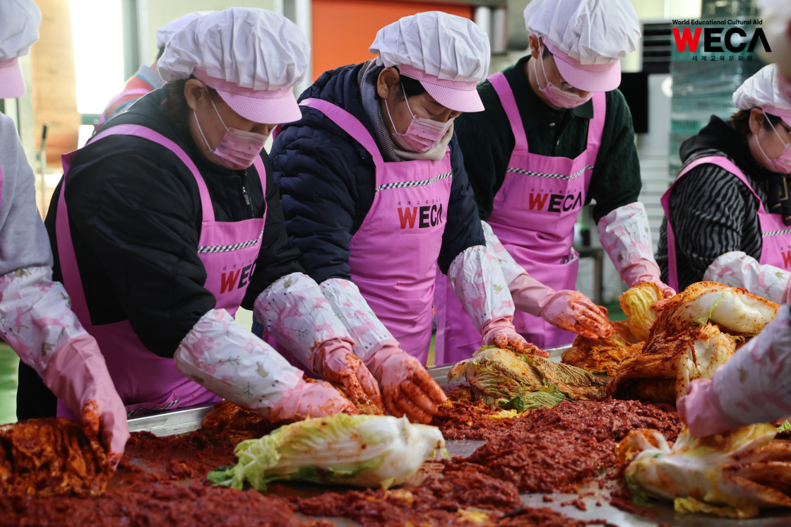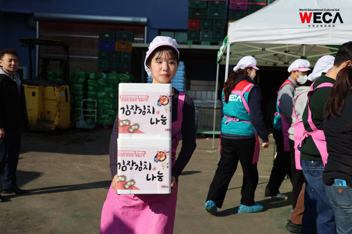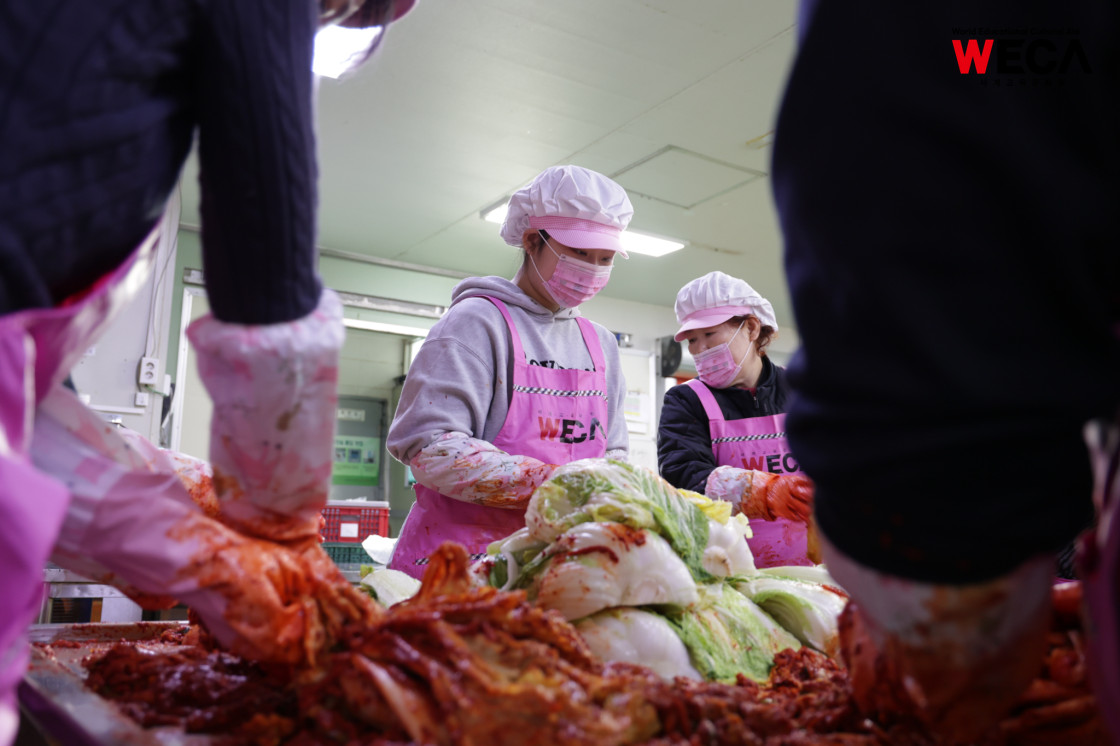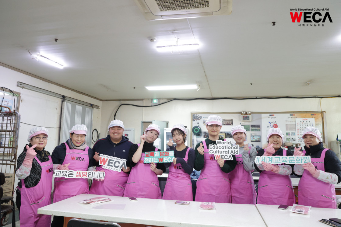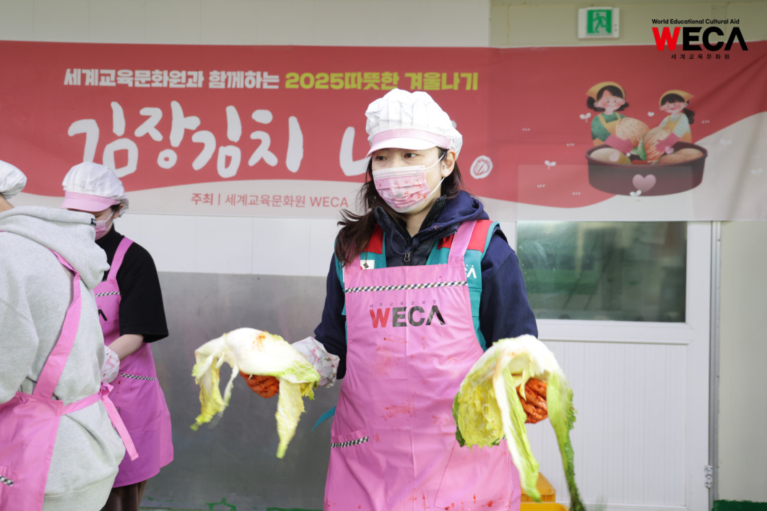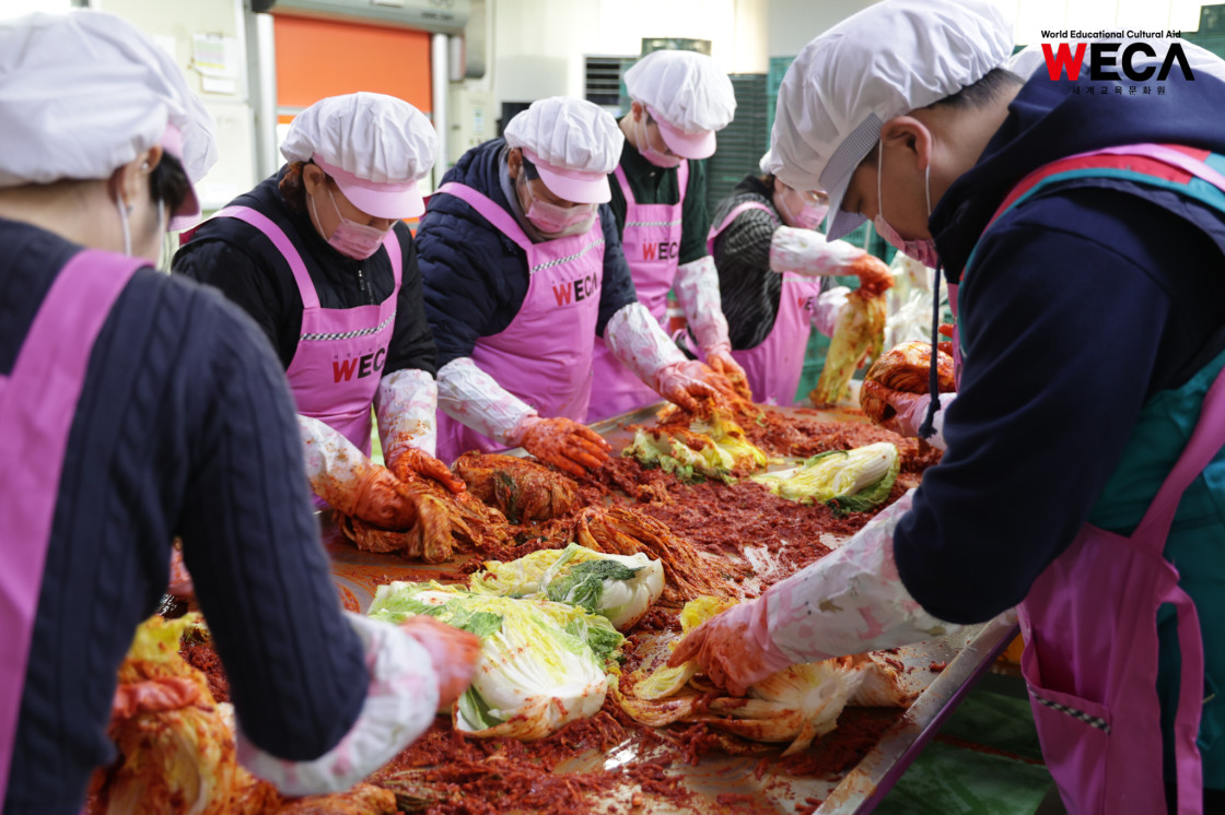 세계교육문화원은 인천 연수구에서 WECA와 함께 담그는 사랑의 2025 김장나눔 봉사활동을 진행했습니다. 이번 활동은 겨울철 반찬이 부족해 끼니를 챙기기 어려운 다문화가정과 장애인 가정에 따뜻한 식탁을 전하고, 나눔의 가치를 함께 실천하기 위해 마련되었습니다. 이날 현장에는 WECA 임직원과 서포터즈, 자원봉사자 등 총 13명이 참여했습니다. 봉사자들은 사전 오리엔테이션을 통해 김장 봉사의 취지와 위생 수칙을 공유한 뒤, 위생모와 앞치마를 착용하고 절인 배추에 김장 속을 버무리고 포장하는 작업에 정성껏 임했습니다.