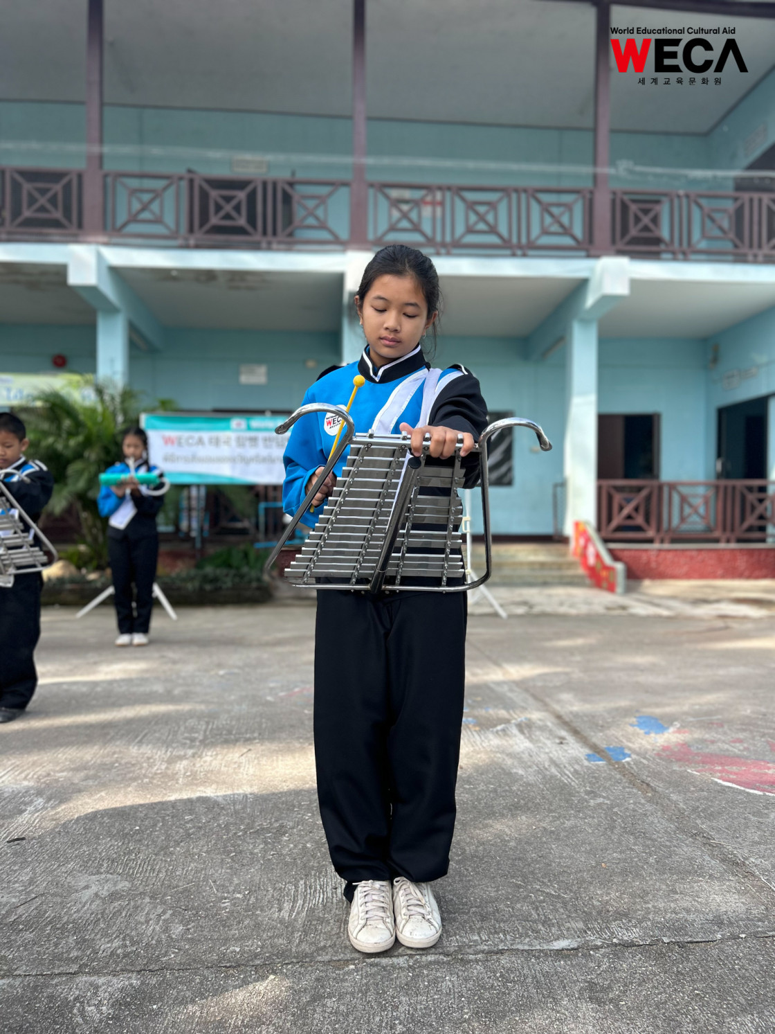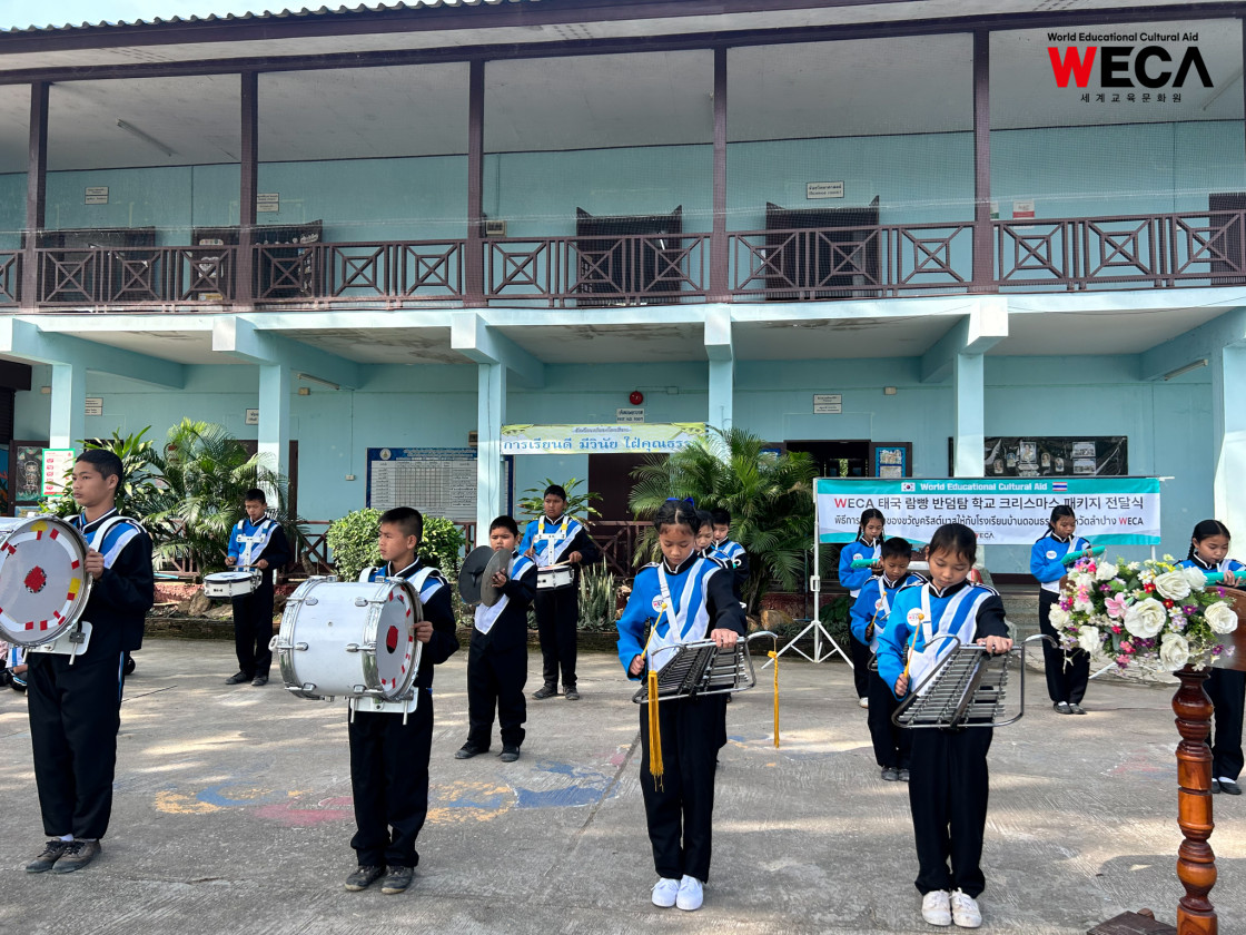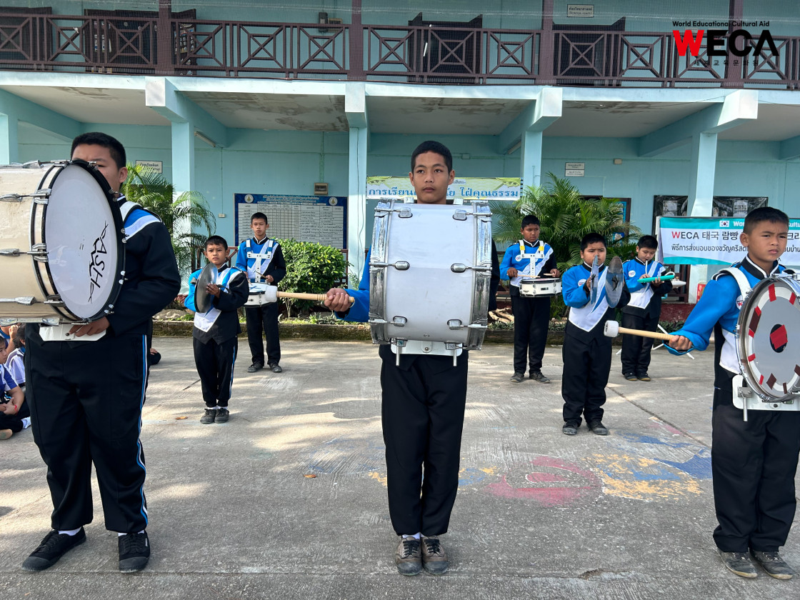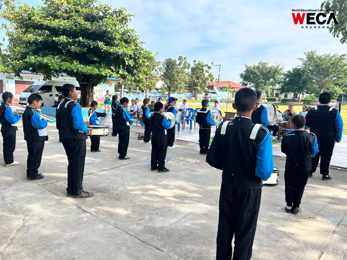 태국 반던탐 지역에서 WECA의 지원으로 운영되고 있는 반던탐 학교 합주부가 출장팀을 맞이하기 위해 약 15분간의 환영 공연을 준비했습니다. 문화교육의 기회가 거의 없던 시골 마을에서 아이들이 직접 악기를 연주하며 무대에 서는 모습은, 그 자체로 큰 감동을 전했습니다.