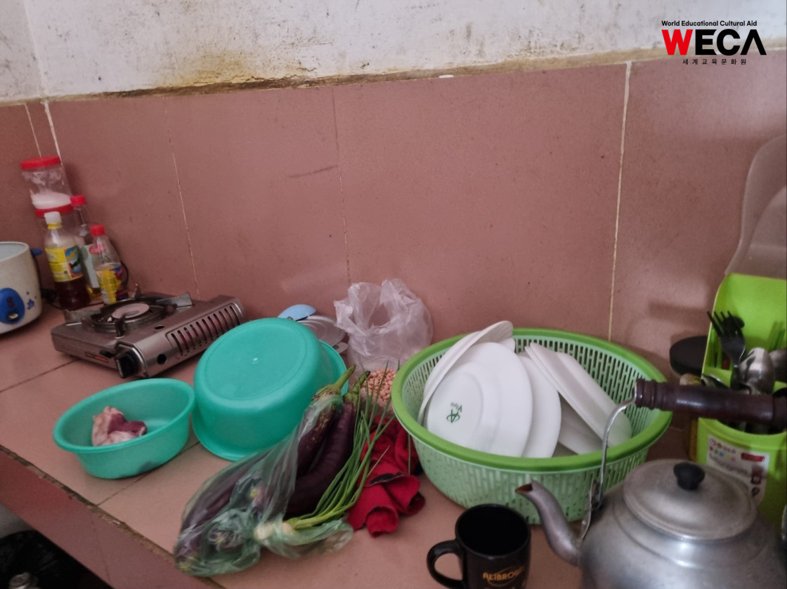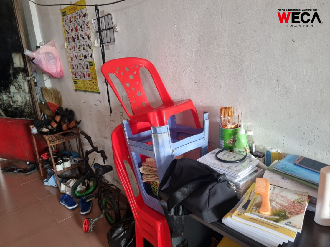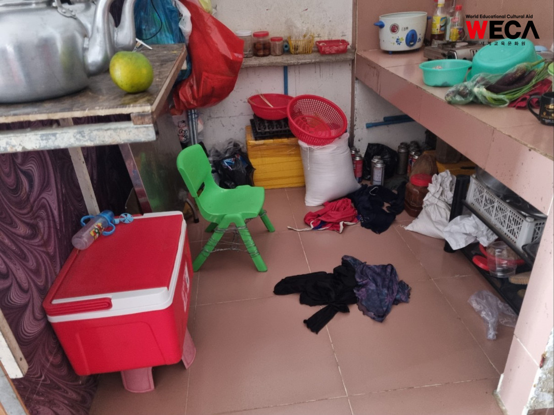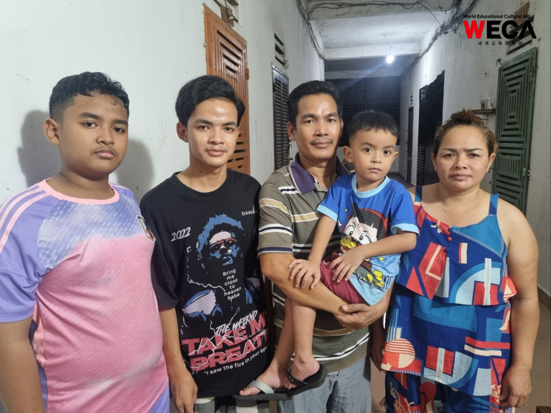 캄보디아 보레이께일라에 사는 WECA 결연 장학생 번듯은 만날 때마다 먼저 웃으며 인사를 건네는 아이입니다. 번듯의 아버지는 뚝뚝 기사로 일하며 한 달 약 200달러의 수입으로 가족을 부양하고 있고, 어머니와 두 명의 남동생까지 다섯 식구는 월세 70달러짜리 방 한 칸에서 함께 지내고 있습니다. 결코 넉넉하지 않은 환경이지만, 번듯은 늘 차분하고 밝은 모습으로 하루를 살아갑니다.