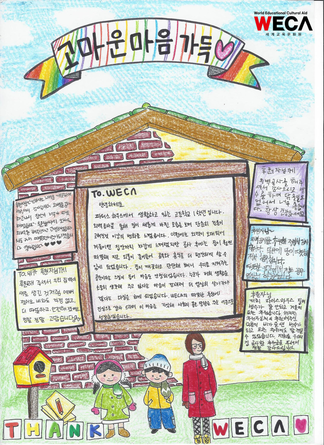 이번 주거환경 개선은 아이들에게 ‘춥지 않은 집’ 그 이상의 의미를 전했습니다. 걱정 없이 잠들 수 있는 밤, 집중할 수 있는 공부 시간, 그리고 스스로를 소중히 여길 수 있는 하루. 세계교육문화원은 앞으로도 아이들의 삶을 가장 가까운 곳에서 지켜보며, 꼭 필요한 변화를 책임 있게 만들어가겠습니다.