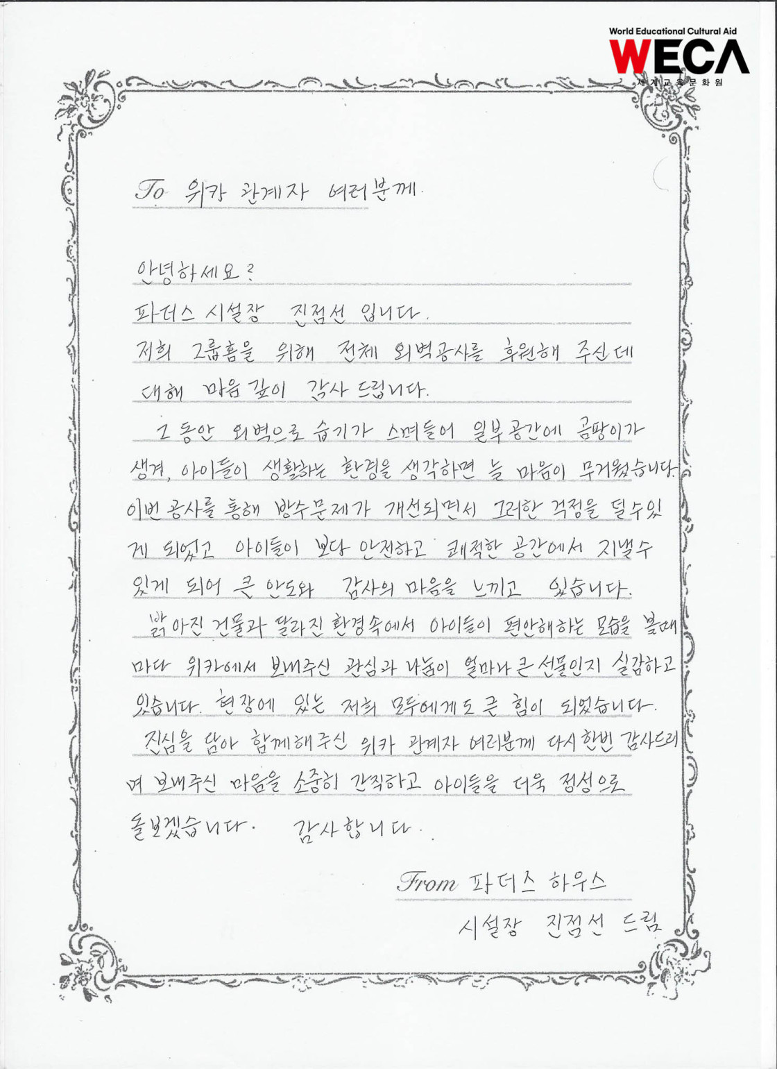 “주거환경은 아이들의 하루와 마음을 지탱하는 가장 기본적인 토대입니다. 이번 외벽 공사는 단순한 보수가 아니라, 아이들이 안심하고 자라고 배울 수 있는 시간을 되돌려주는 일이라고 생각합니다.”라며, “후원자님 한 분 한 분의 마음이 아이들에게는 따뜻한 집이 되고 있습니다.”라고 전했습니다.
