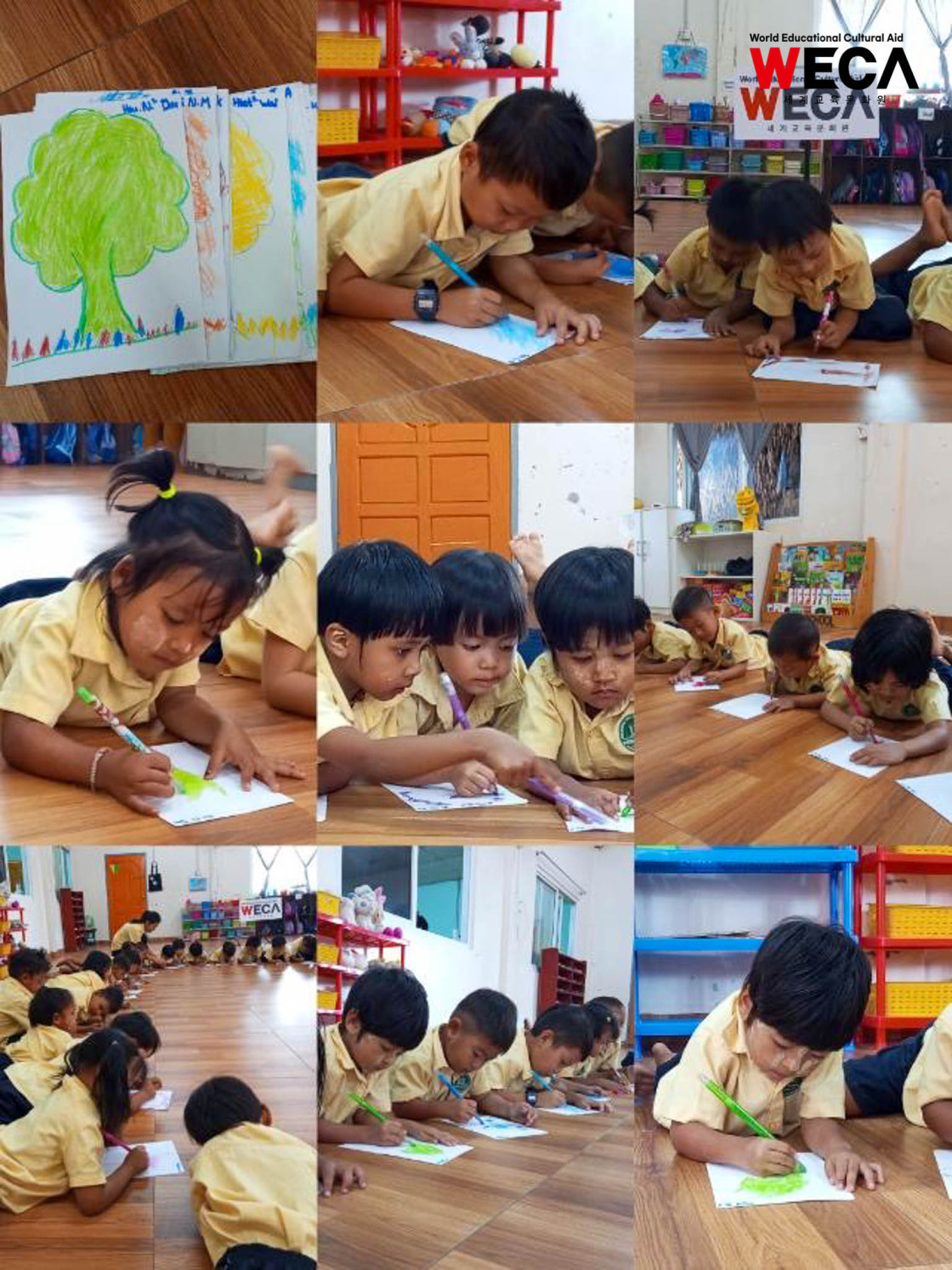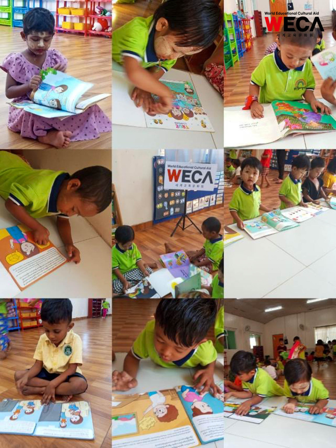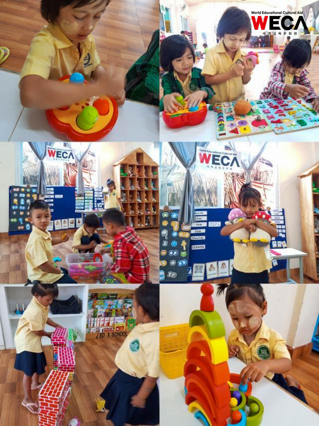 미얀마 양곤 흐멸린칭 위스돔 WECA 유치원에서는 이야기 나누기와 자유 놀이 시간을 비롯해 영어, 미얀마어, 수학, 미술, 과학, 체육, 음악, 세계 여러 나라 배우기, 동화책 읽기 등 다양한 수업이 진행되었습니다. 아이들은 균형 잡힌 교육 활동 속에서 배우고 뛰놀며 즐거운 시간을 보냈습니다.
